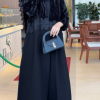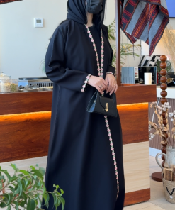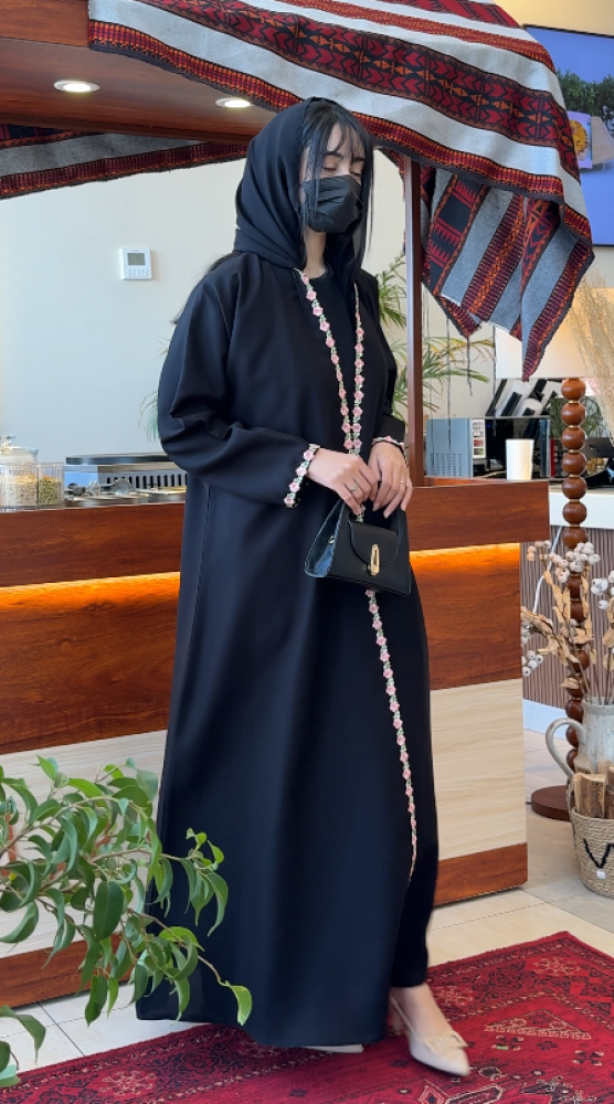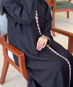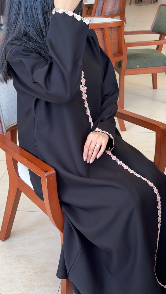 عباية سوداء كلاسكية بتصميم ناعم جداً، تبرز جمالها التطريزات الوردية الممتدة على الواجهة والأكمام، لتمنحك إطلالة أنثوية ملفتة بطريقة راقية وغير مبالغ فيها.