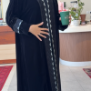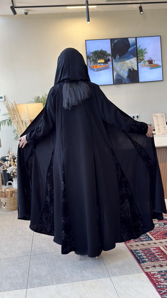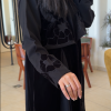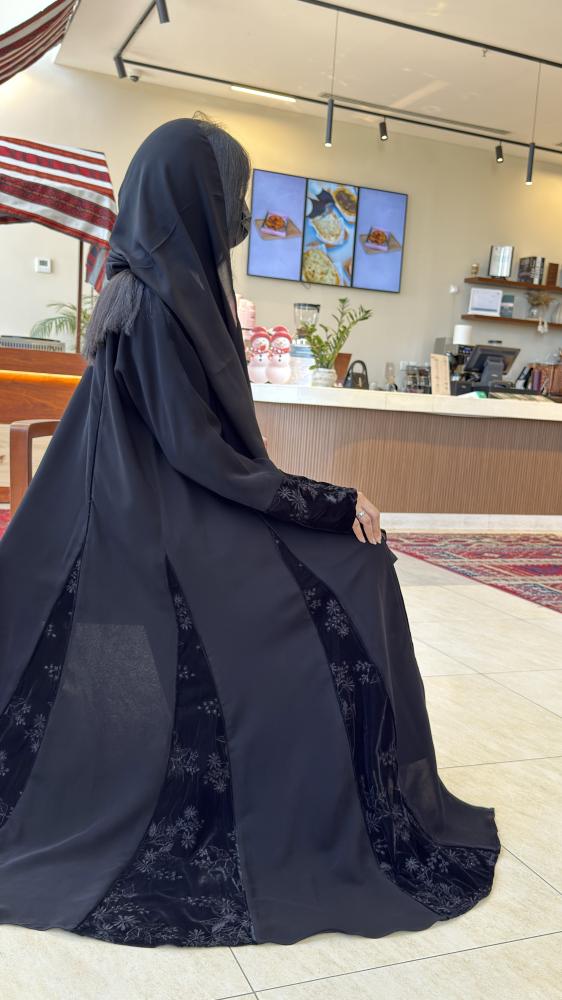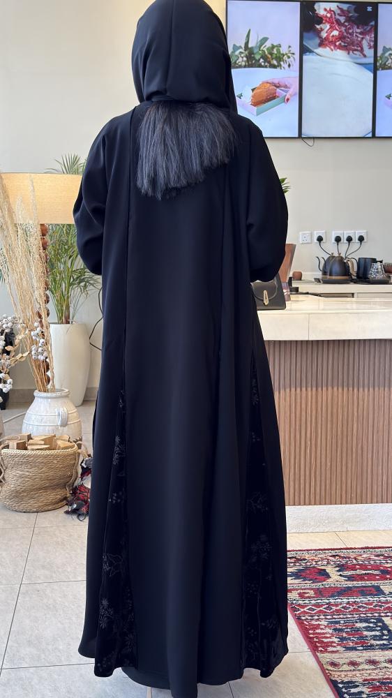 إطلالة راقية تجمع بين البساطة والفخامة… عباية سوداء بخامة انسيابية خفيفة تمنحك راحة وأناقة في نفس الوقت، وتأتي بتطريز ناعم على الأكمام والجوانب ليضفي لمسة فاخرة elevates your look.