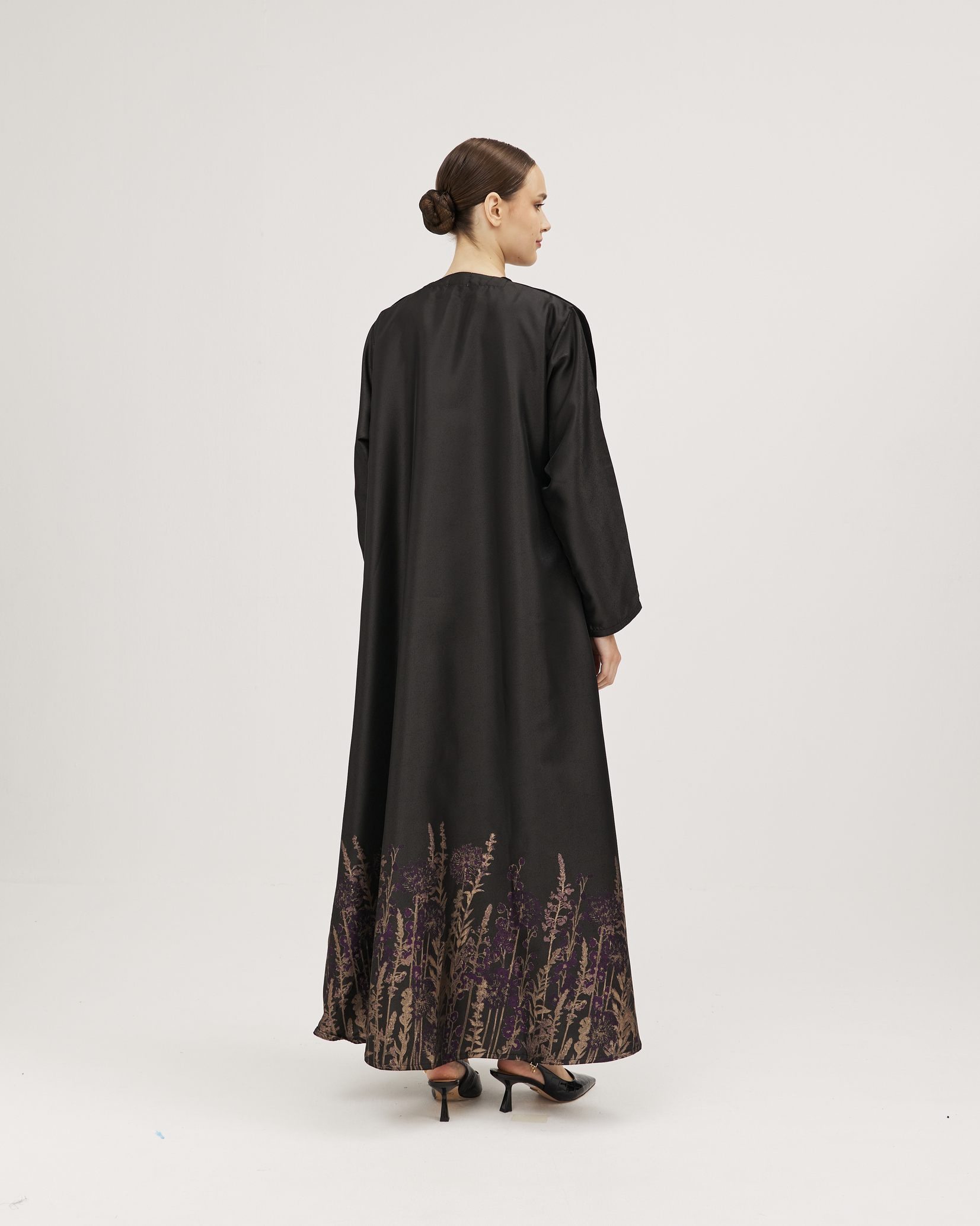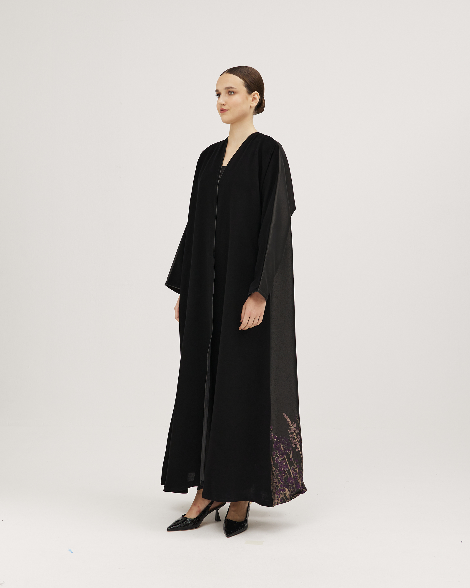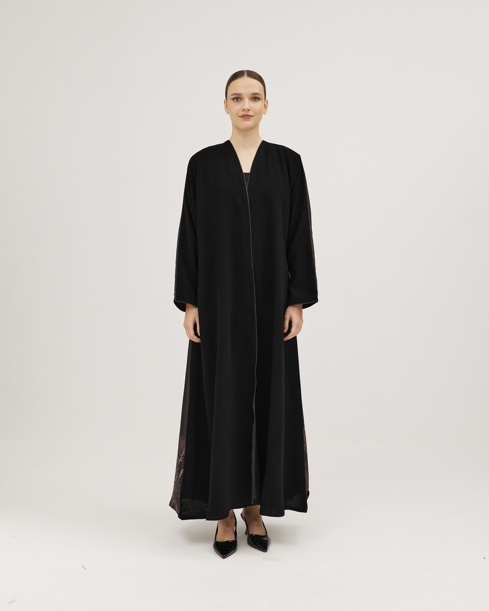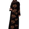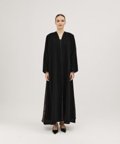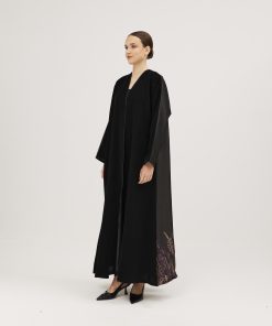 عبايات سوروزيه – عباية كتان كلوش بطقطق وأكمام مقلوبة مشجرة بالريش – أسود