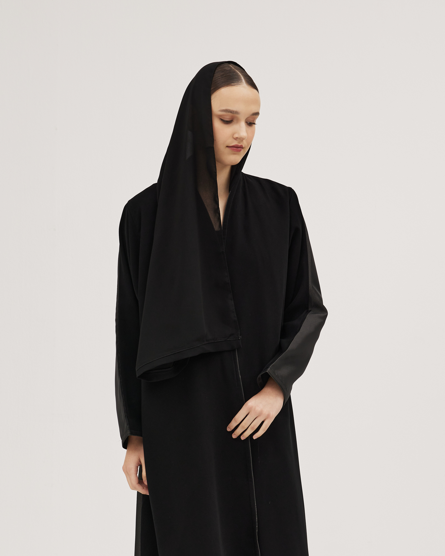 عبايات سوروزيه – عبايات لينن نص كلوش بتصميم لف وتطريز زخرفي بخيوط سوداء – تيفاني