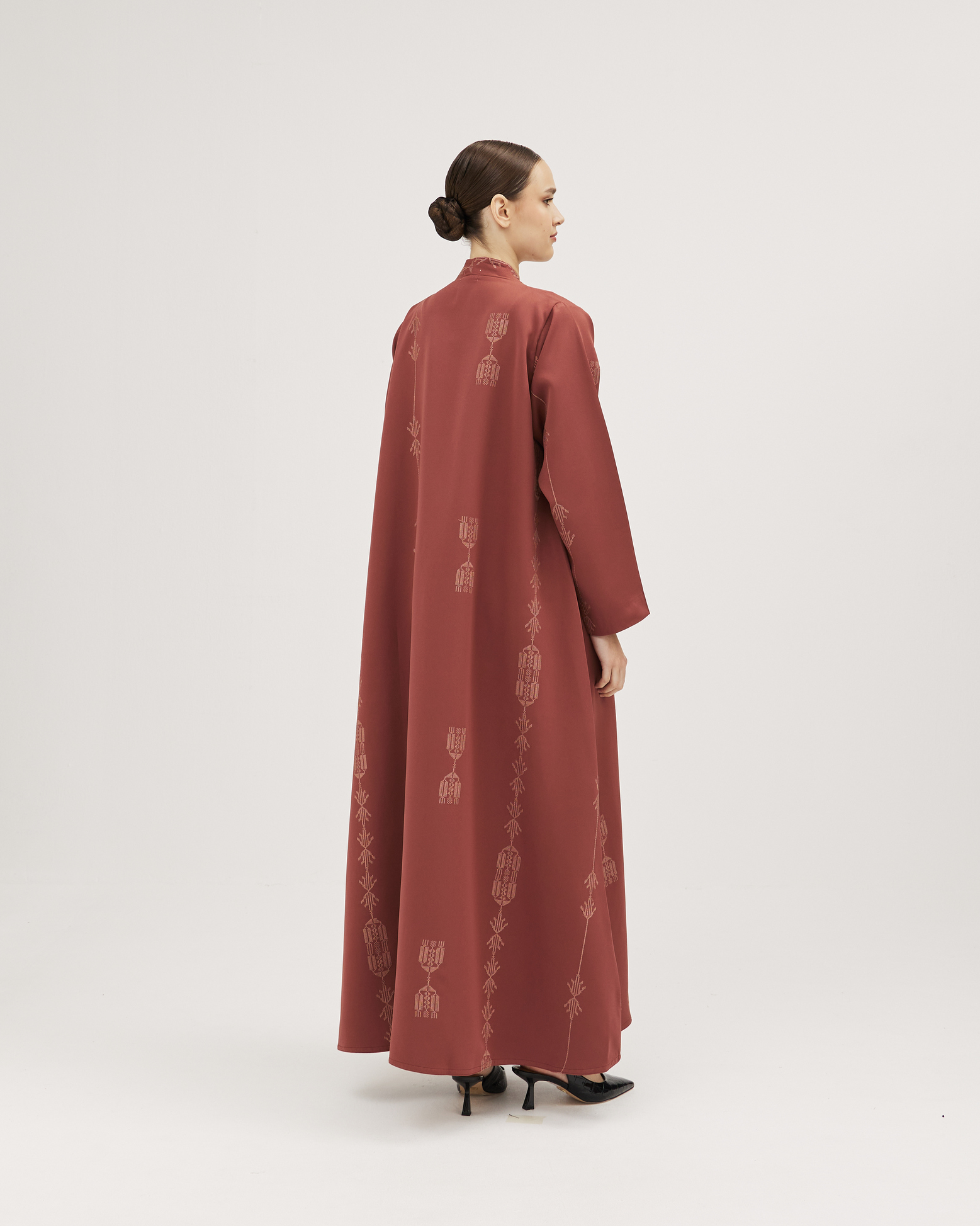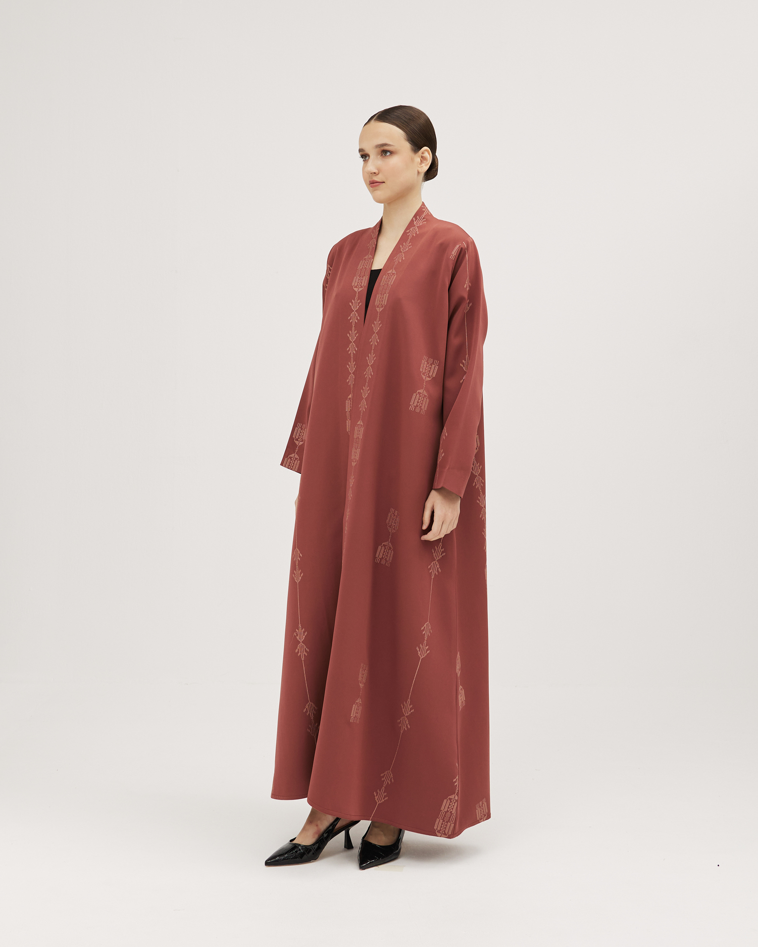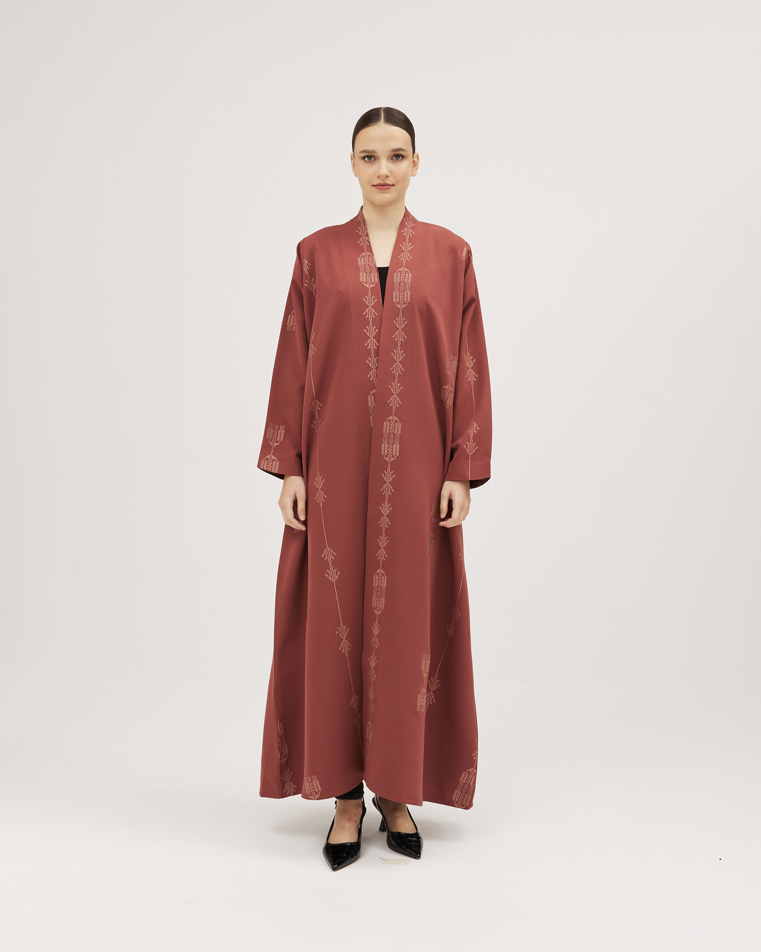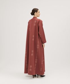 عبايات سوروزيه – عباية زيتي من قماش لنن بتطريز أمامي أنيق