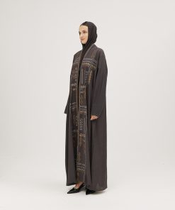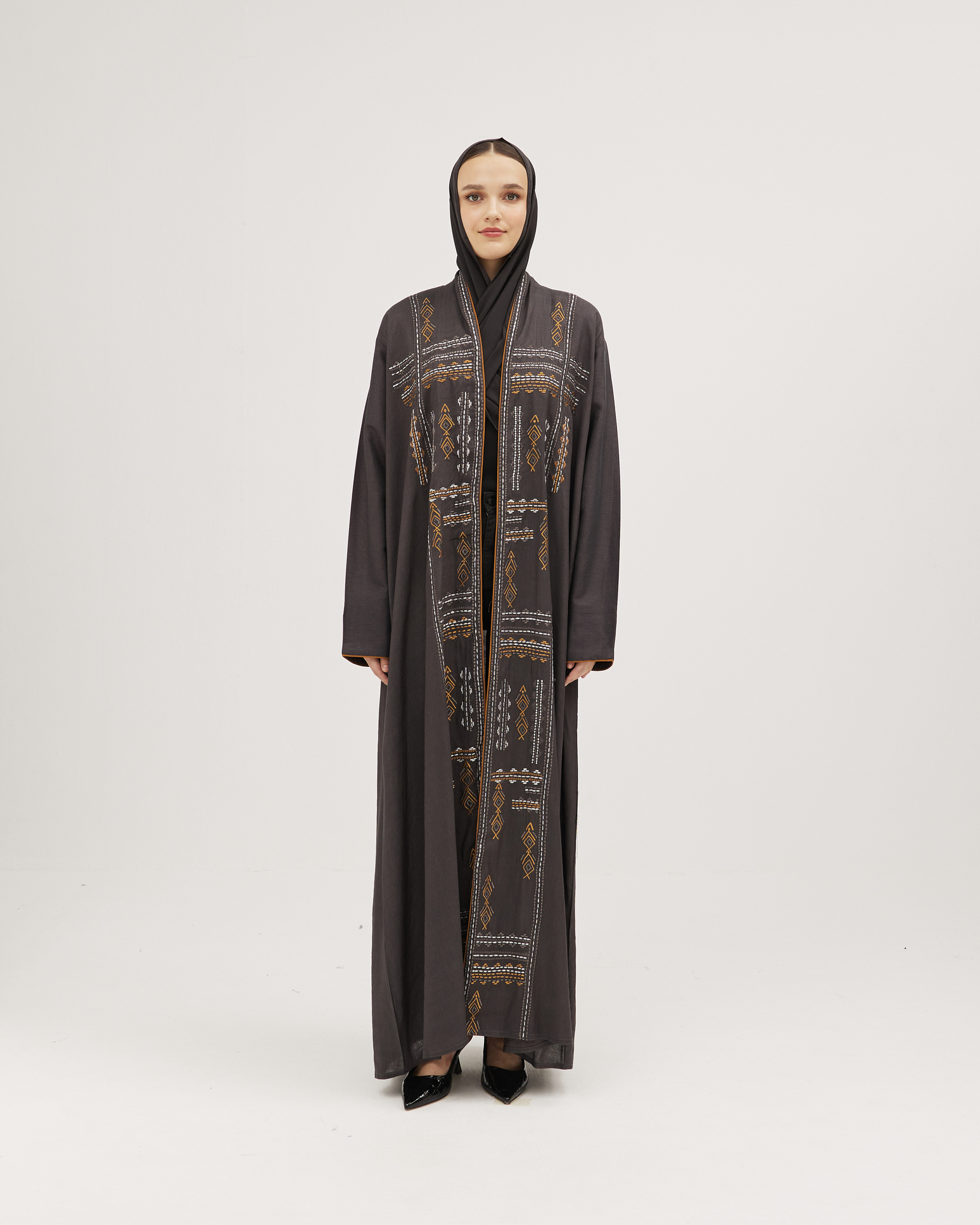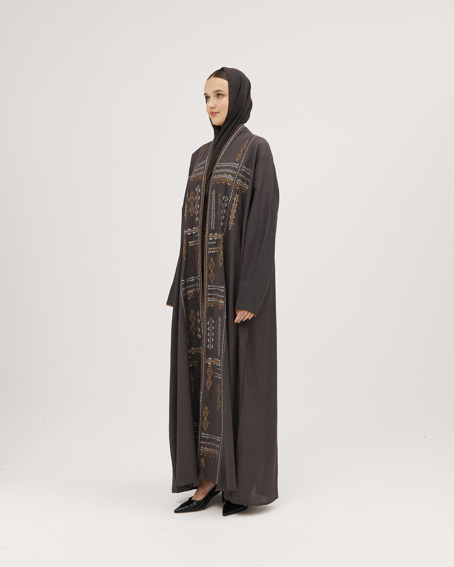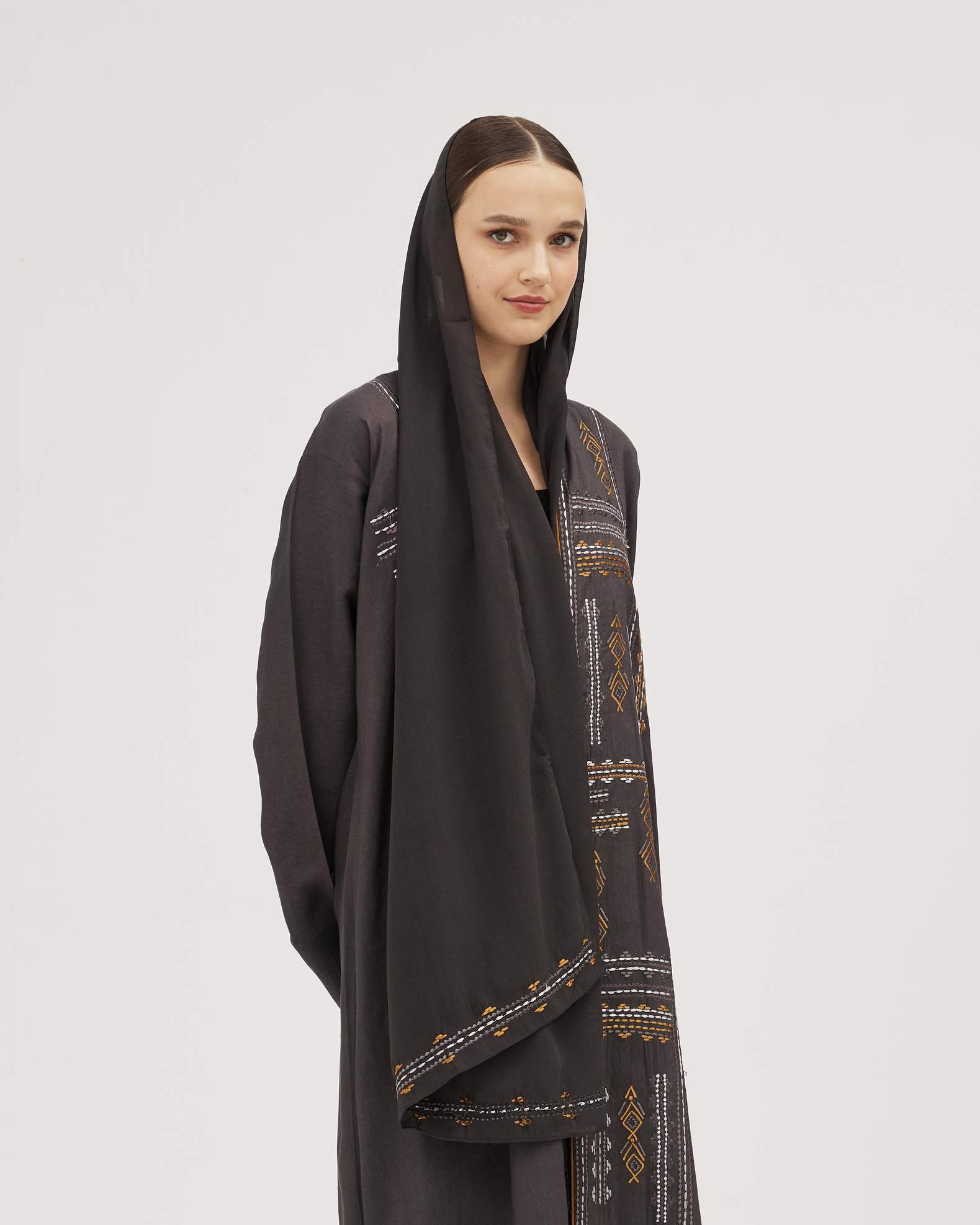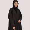 عبايات سوروزيه – عباية كتان كلوش بطقطق وأكمام مقلوبة مشجرة بالريش – أسود