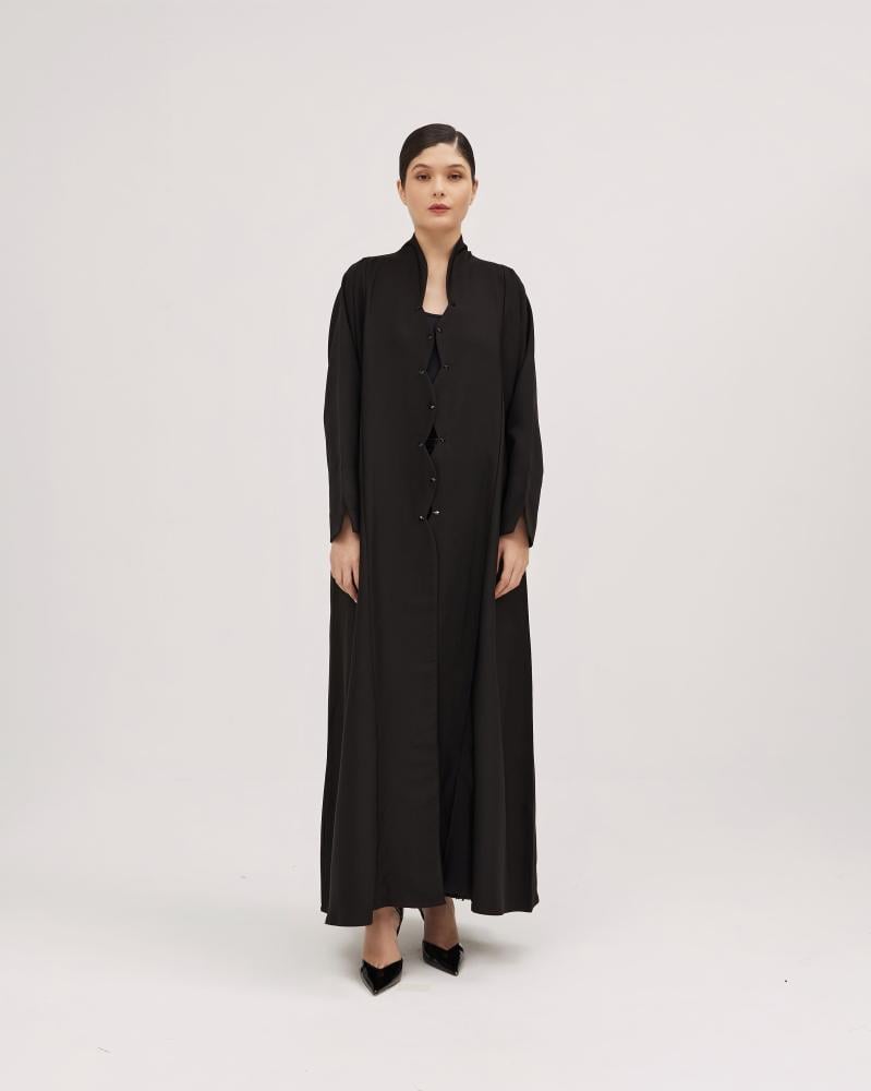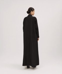 عبايات سوروزيه – عباية كتان نص كلوش سوداء مزينة بشك أبيض