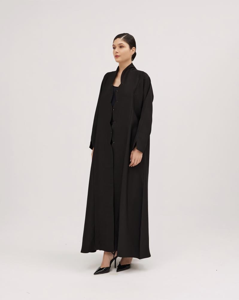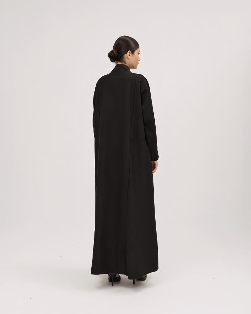 عبايات سوروزيه – عباية كريب نص كلوش بتصميم لف وياقة أنيقة – لون أسود