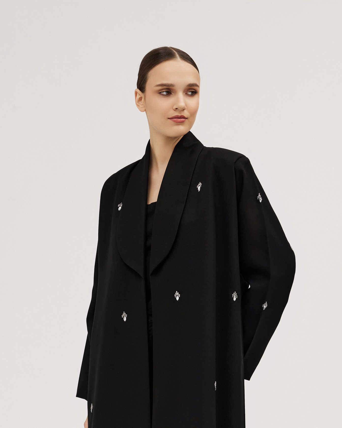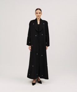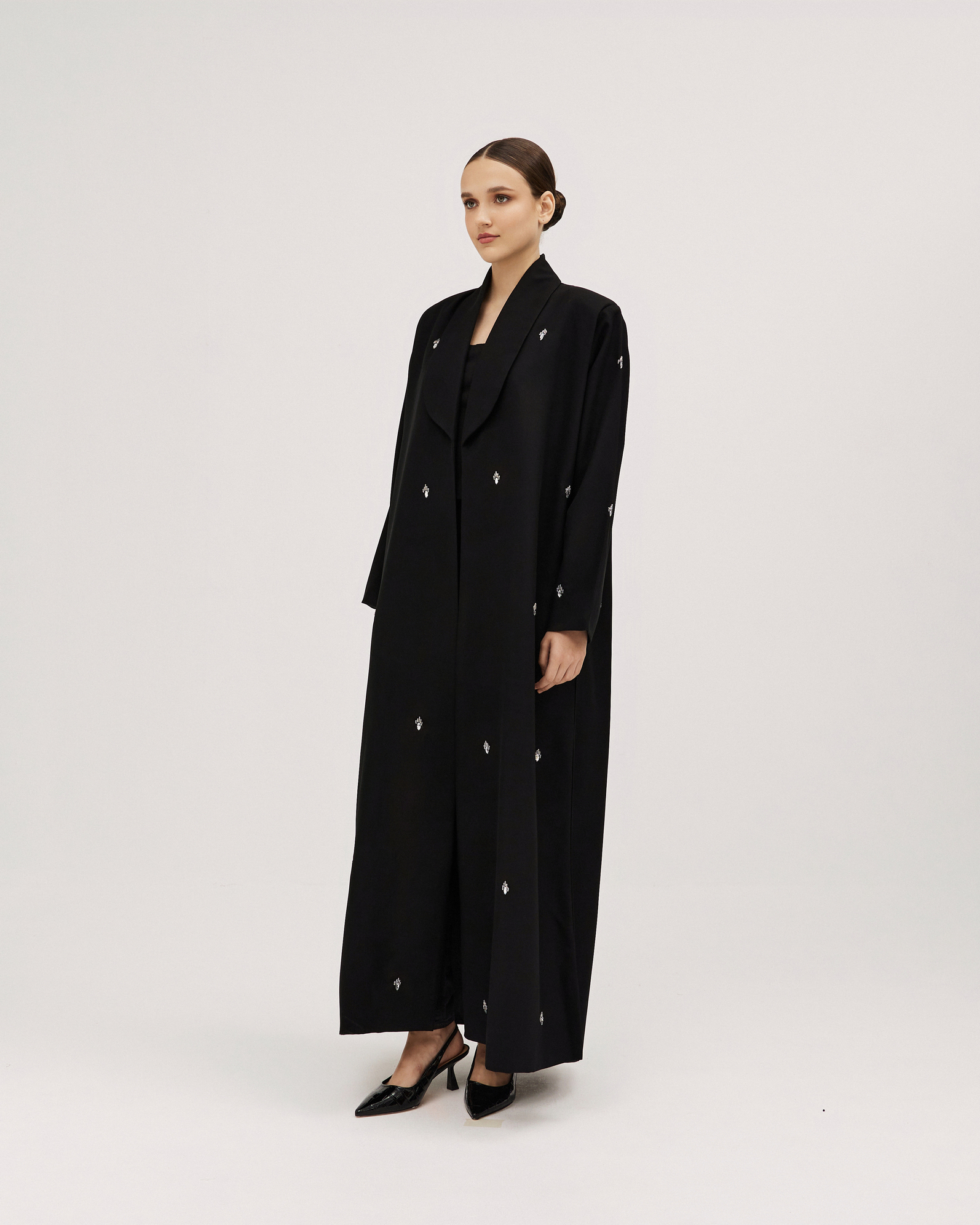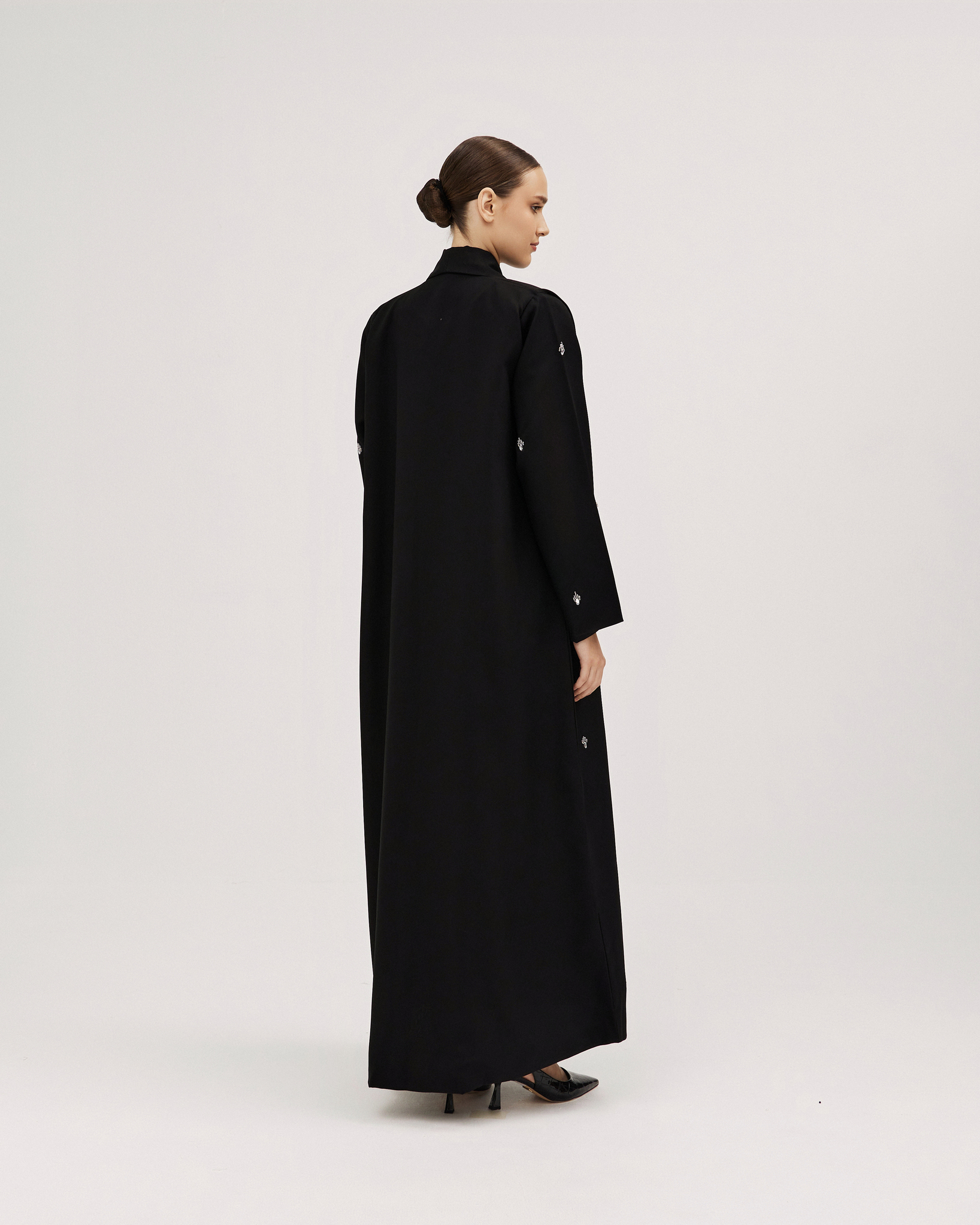 عبايات سوروزيه – عباية كريب كلوش سوداء بتصميم لف مزينة بشك فاخر