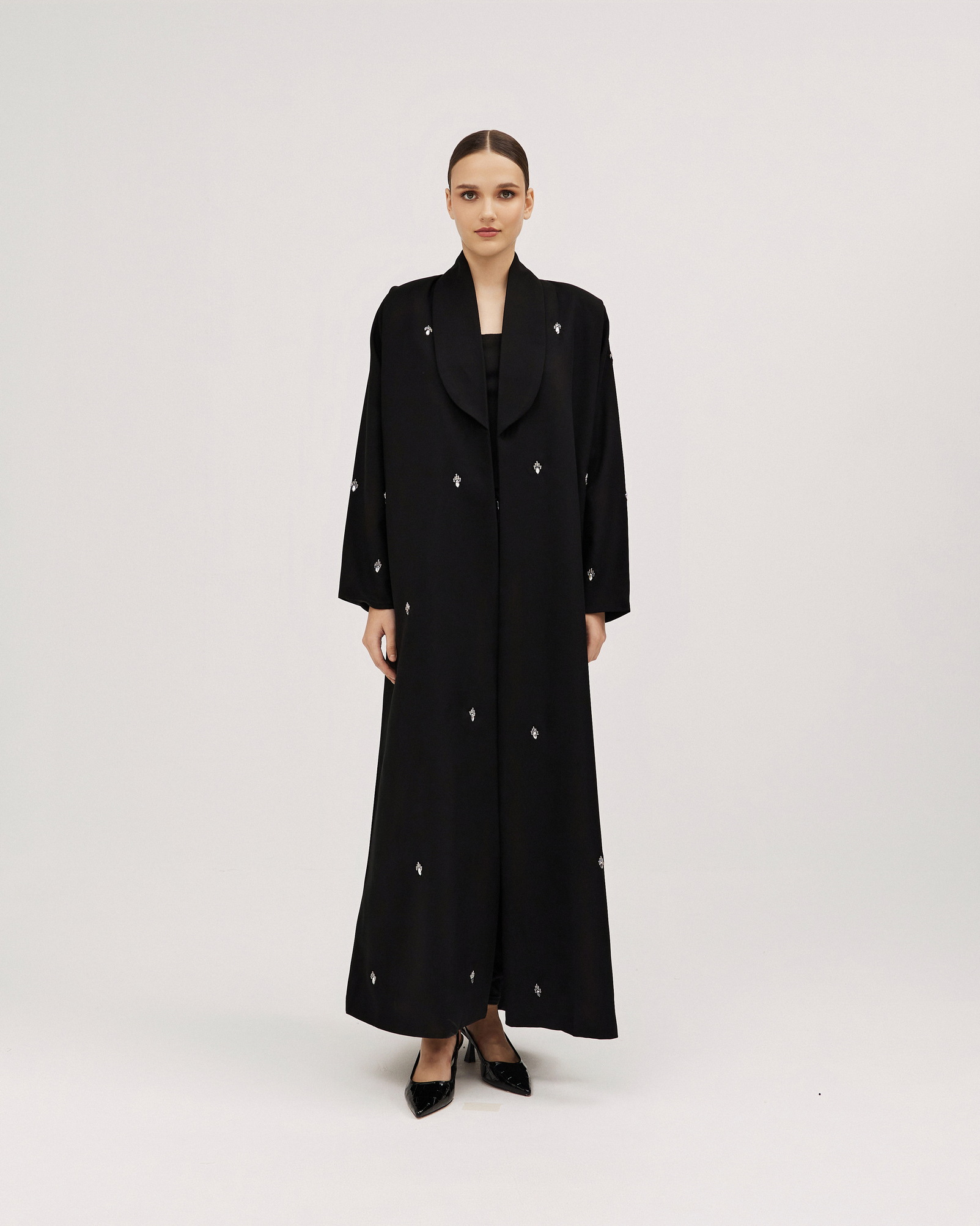 عبايات سوروزيه – عبايات لينن نص كلوش بتصميم لف وتطريز زخرفي بخيوط سوداء – تيفاني