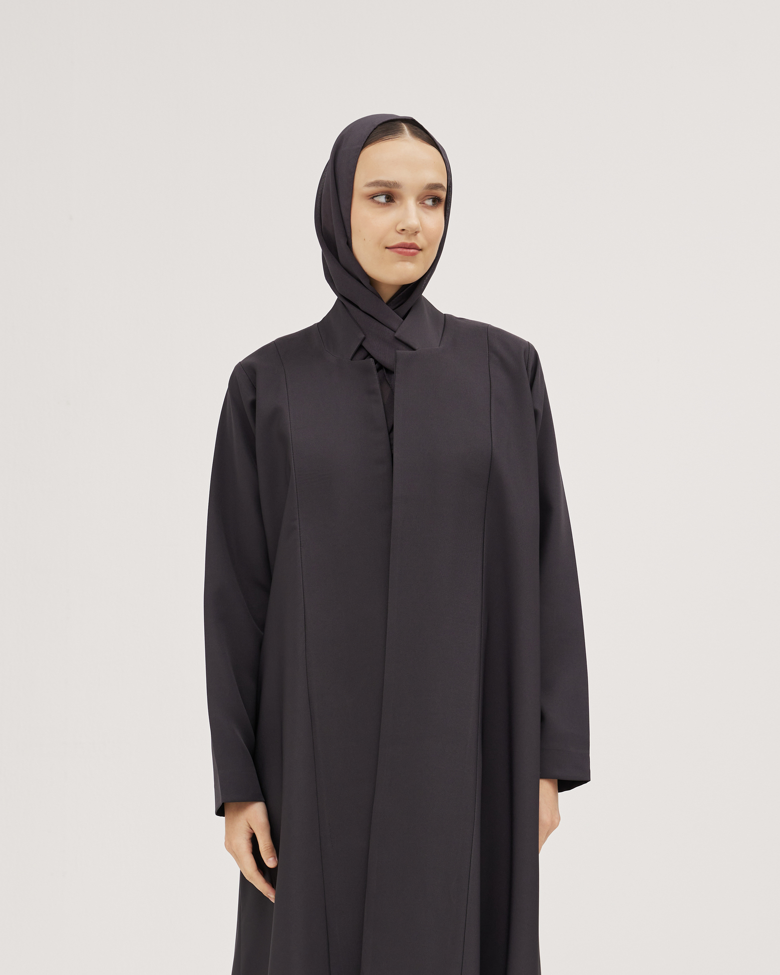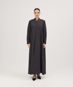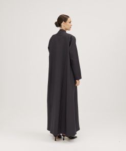 عبايات سوروزيه – عباية زيتي من قماش لنن بتطريز أمامي أنيق