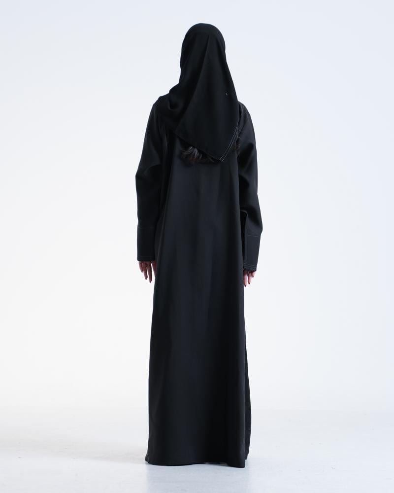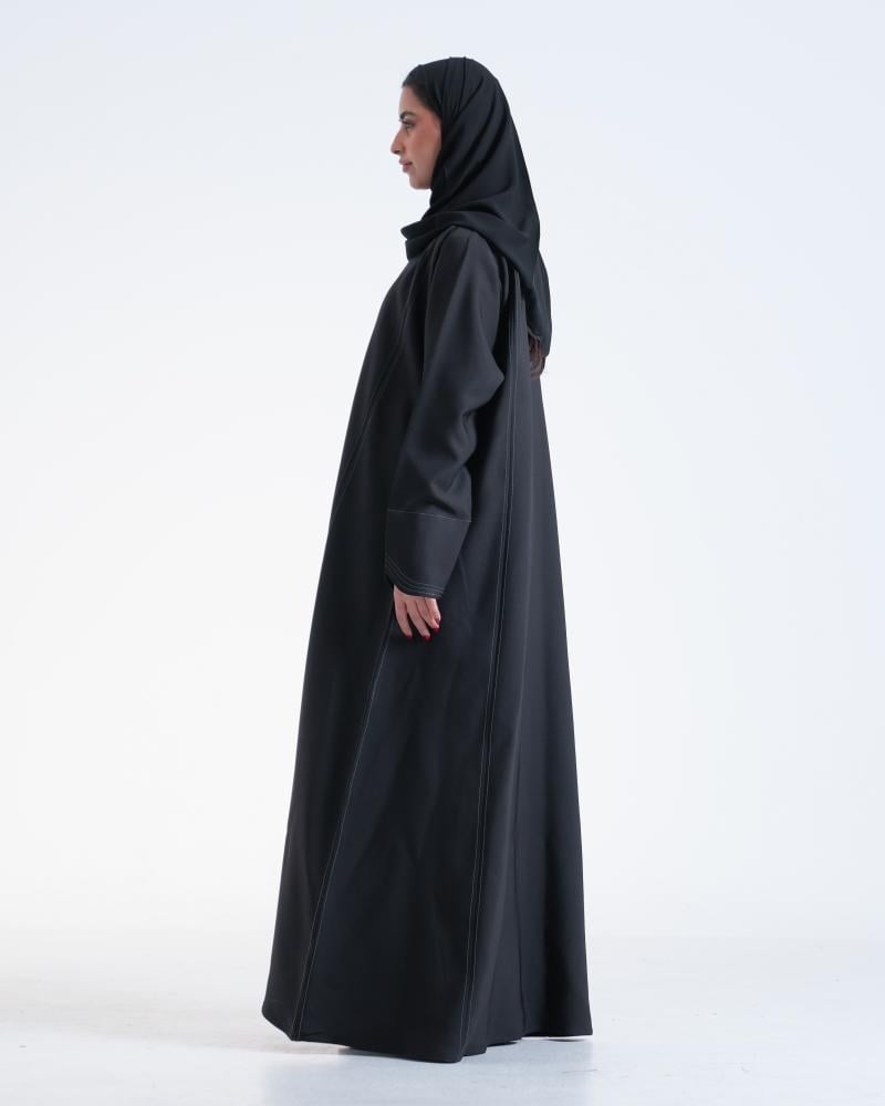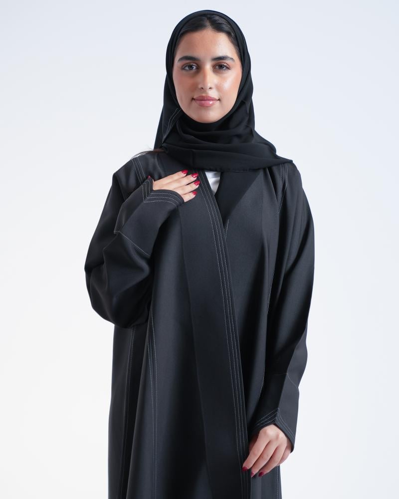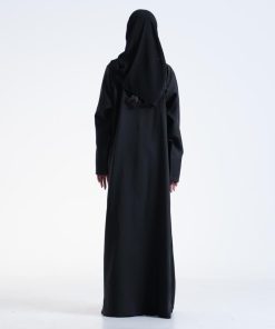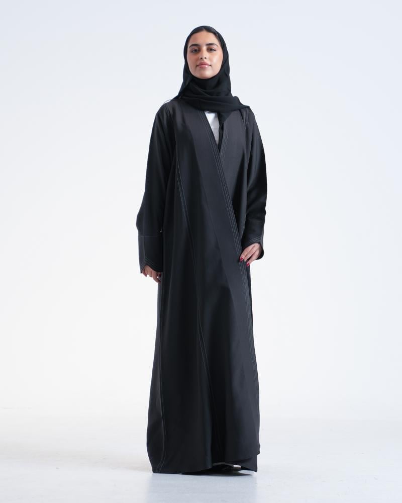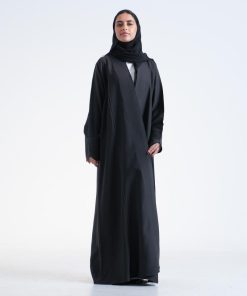 عبايات سوروزيه – عباية كتان نص كلوش سوداء مزينة بشك أبيض