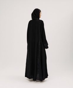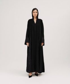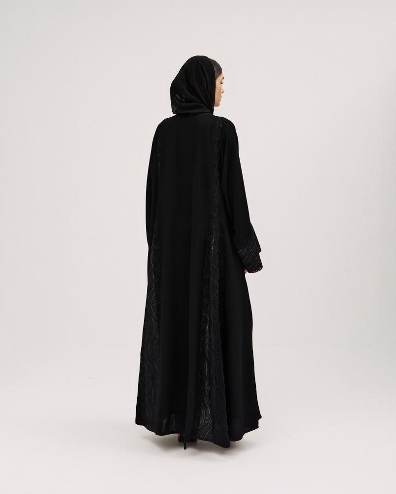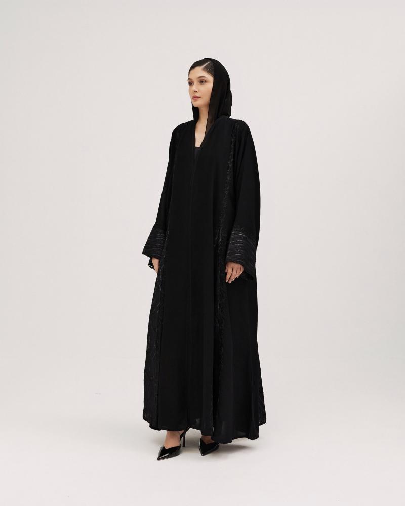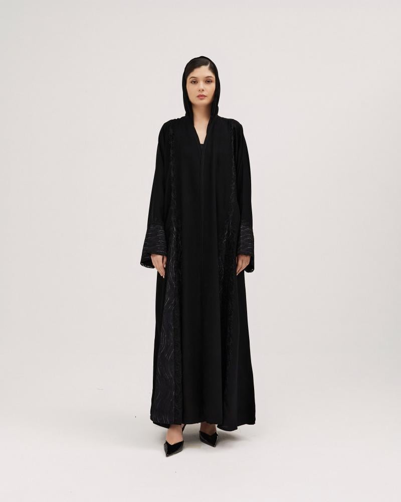 عبايات سوروزيه – عباية سادة انترنت دبل كلوش مزينة بخطوط طولية – لون أسود