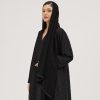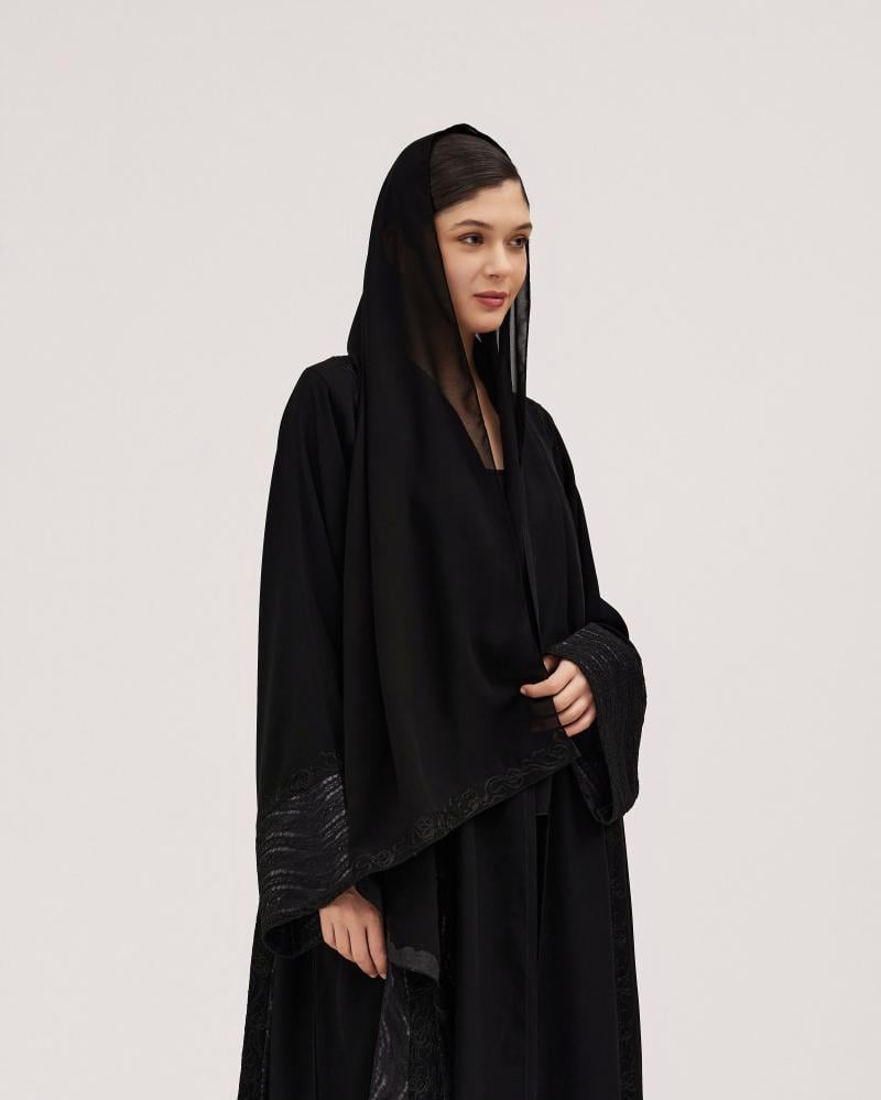 عبايات سوروزيه – عبايات لينن نص كلوش بتصميم لف وتطريز زخرفي بخيوط سوداء – تيفاني
