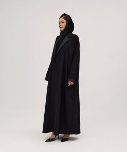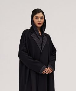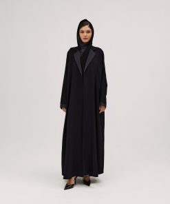 عبايات سوروزيه – عباية كتان نص كلوش سوداء مزينة بشك أبيض