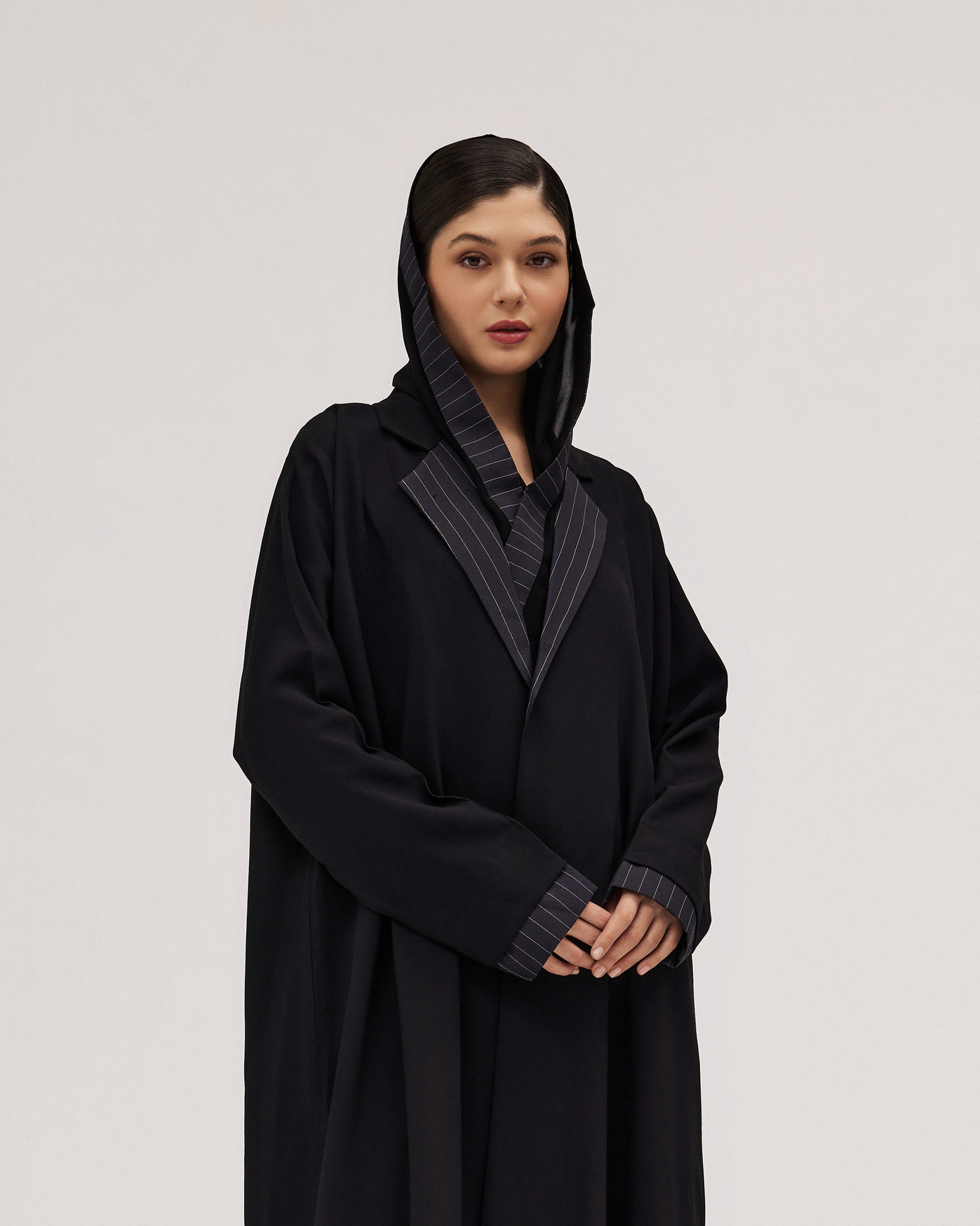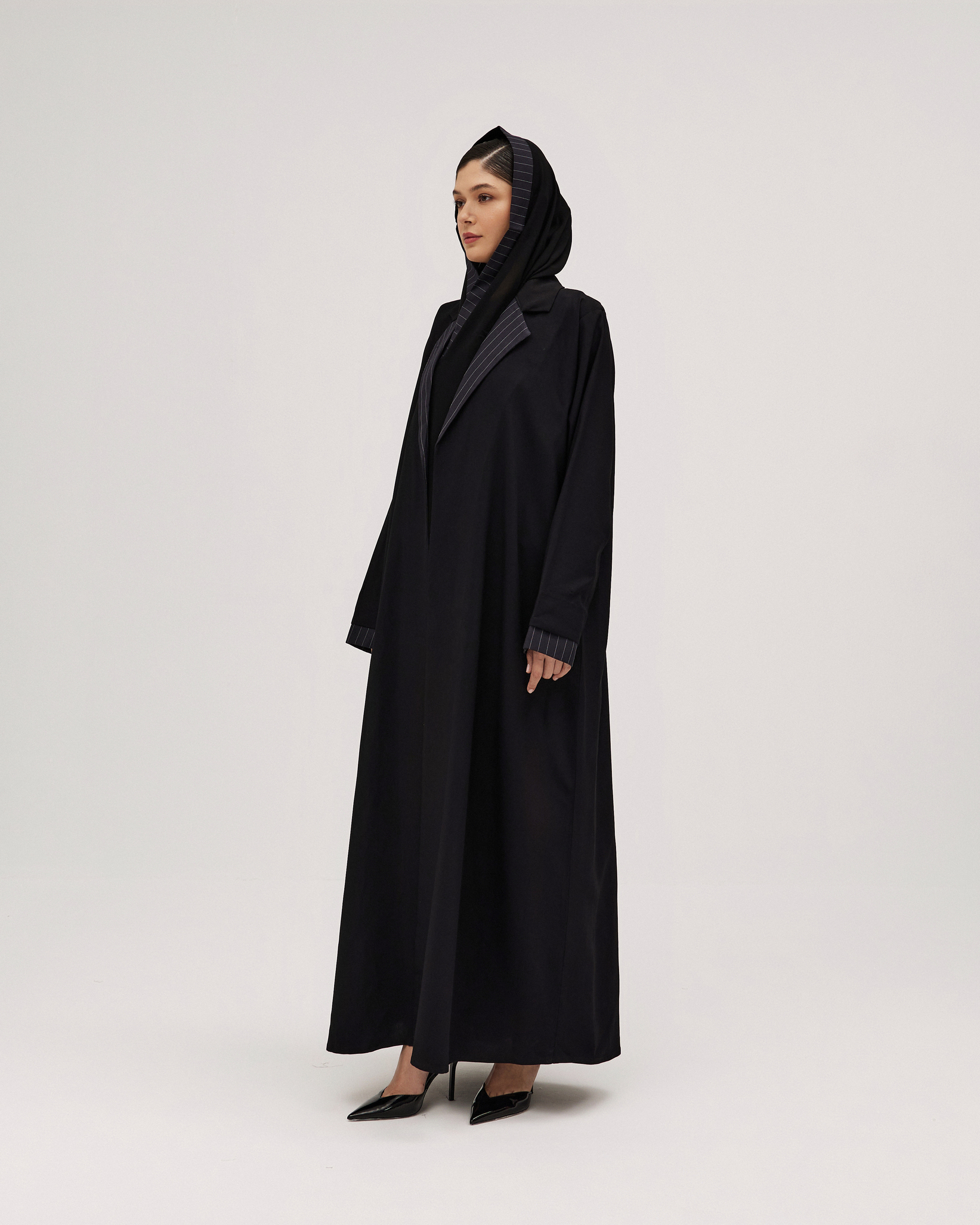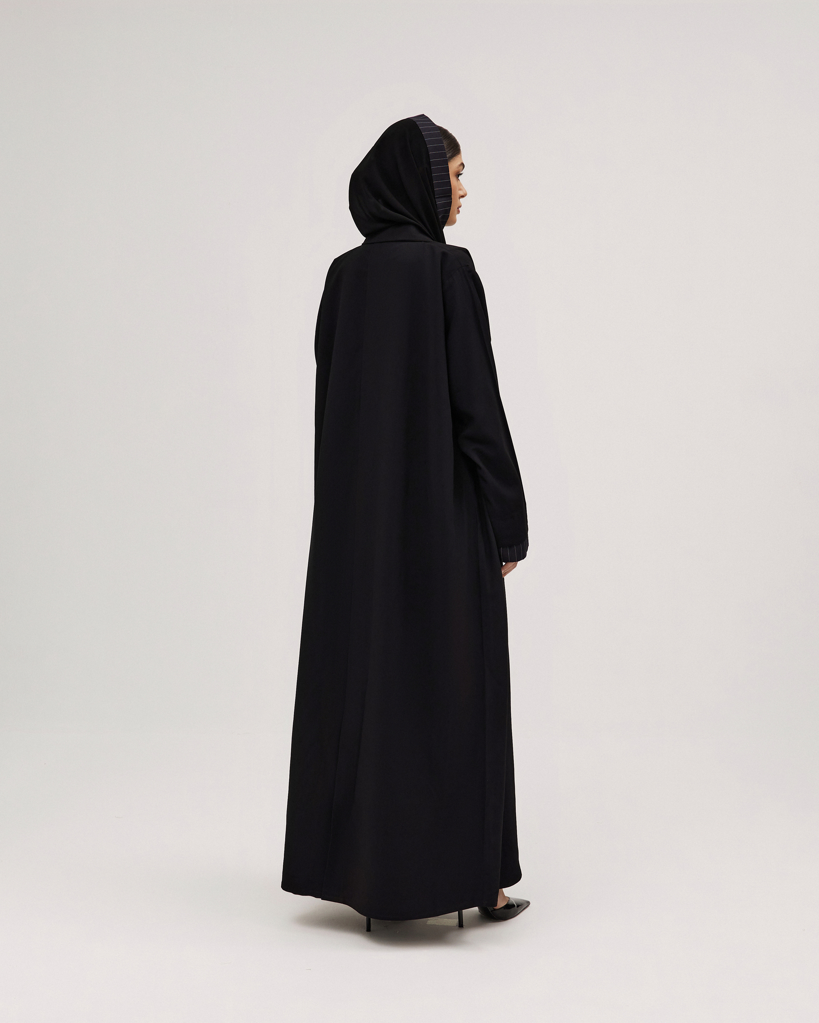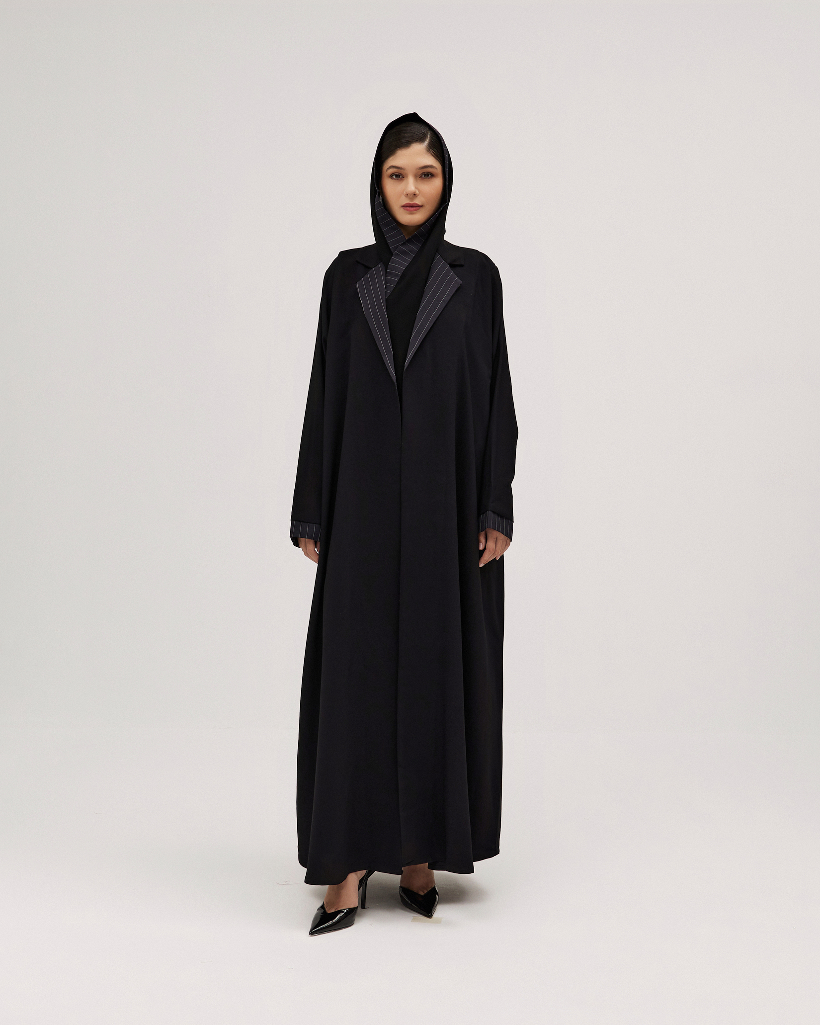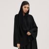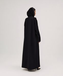 عبايات سوروزيه – عباية كتان كلوش بطقطق وأكمام مقلوبة مشجرة بالريش – أسود