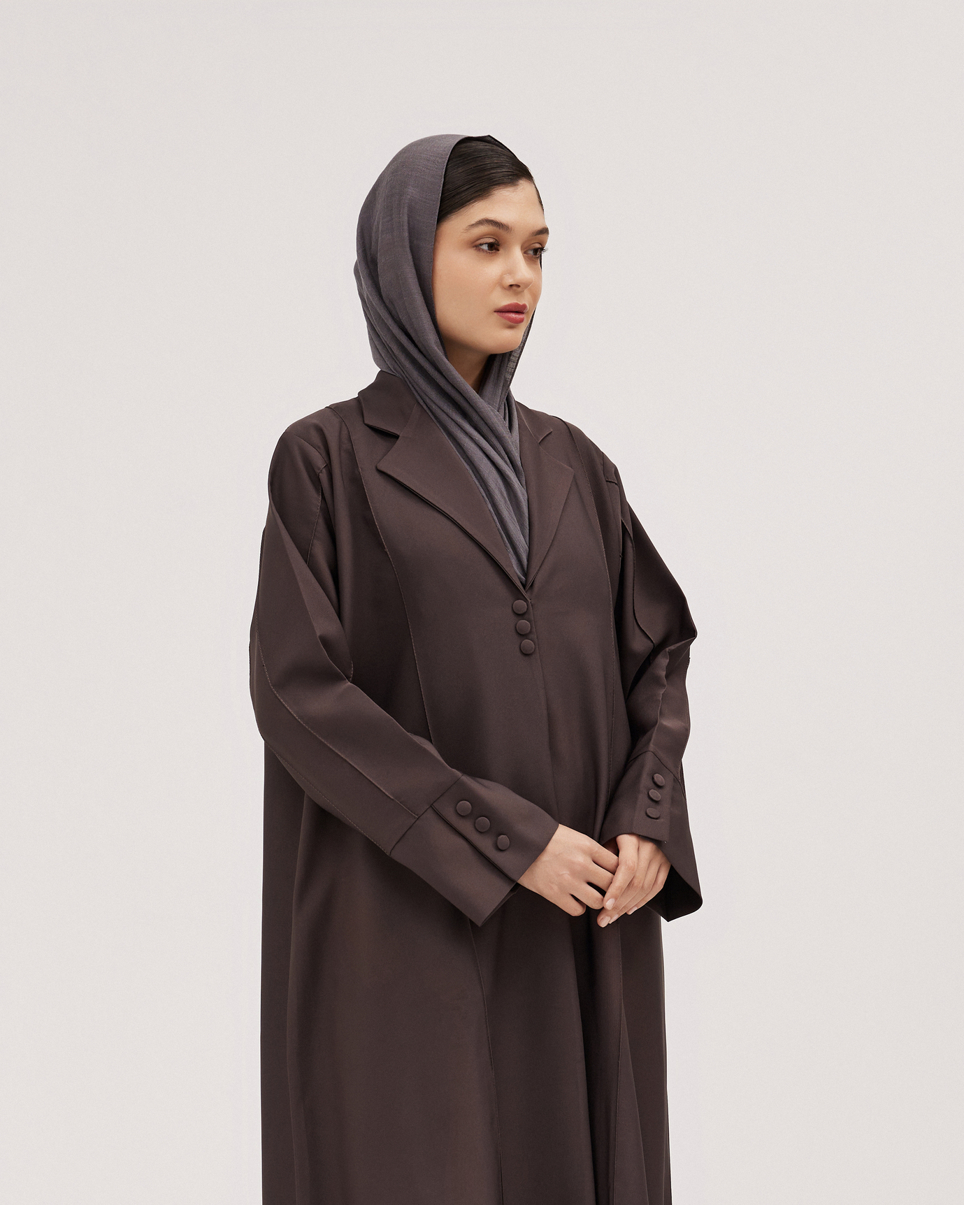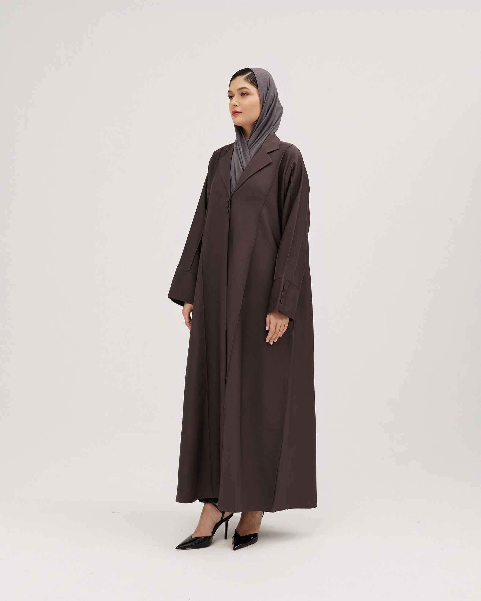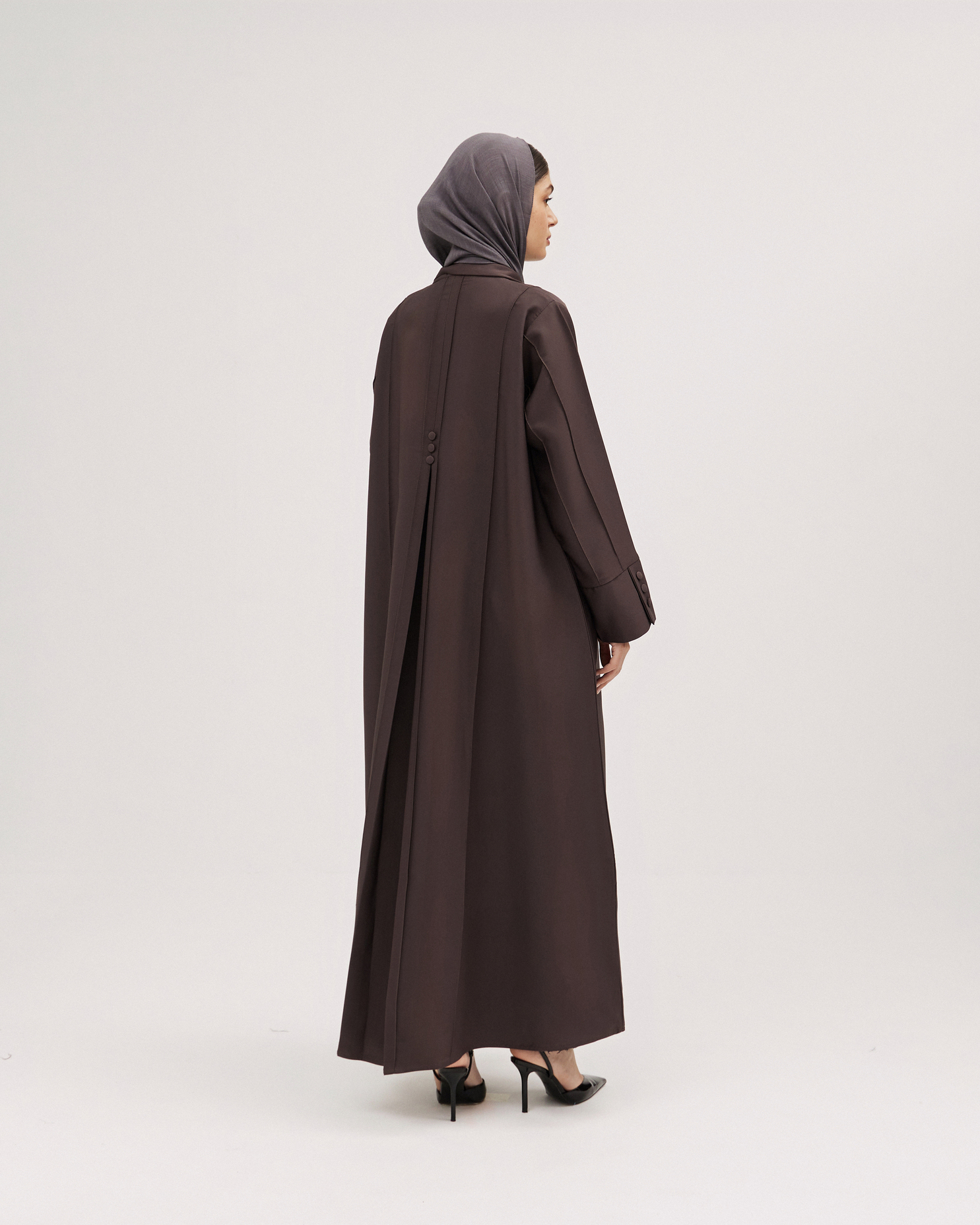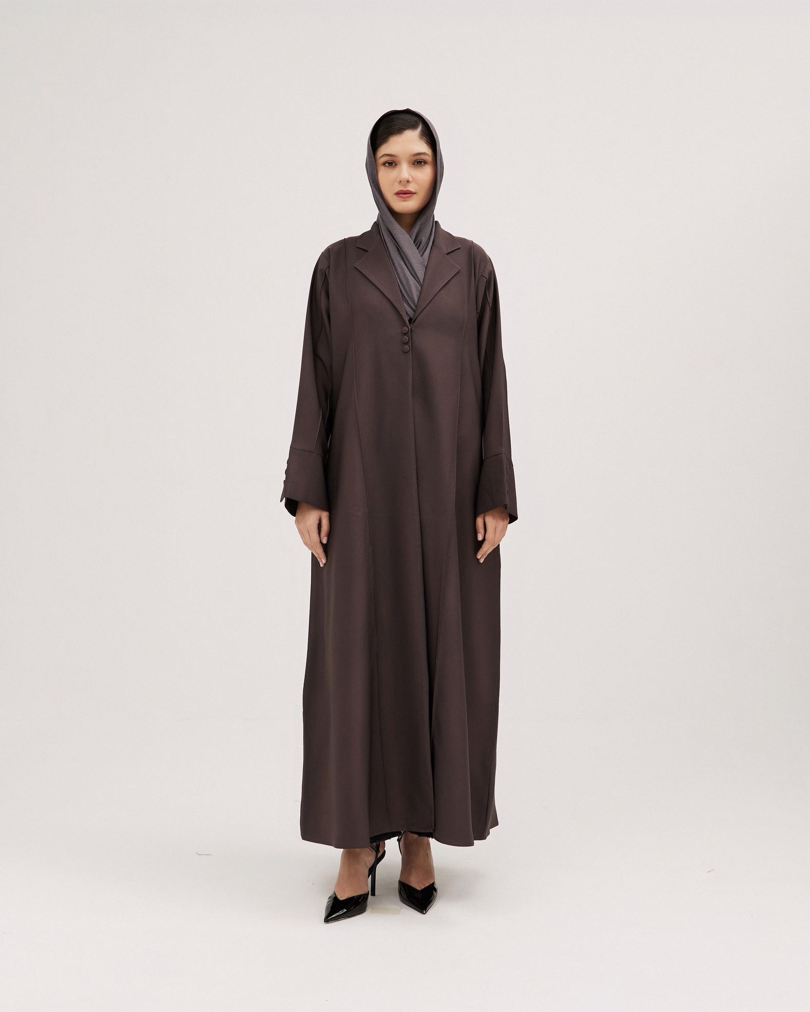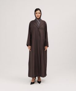 عبايات سوروزيه – عباية كتان كلوش عملية بجيوب وياقة مزينة بأزرار – بيج