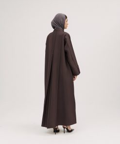 عبايات سوروزيه – عباية باربي كلوش بتصميم لف وكم مقلوب – زيتي ببطانة مشجرة مغطاة بشيفون