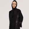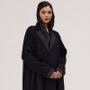 عبايات سوروزيه – عباية كتان كلوش بطقطق وأكمام مقلوبة مشجرة بالريش – أسود