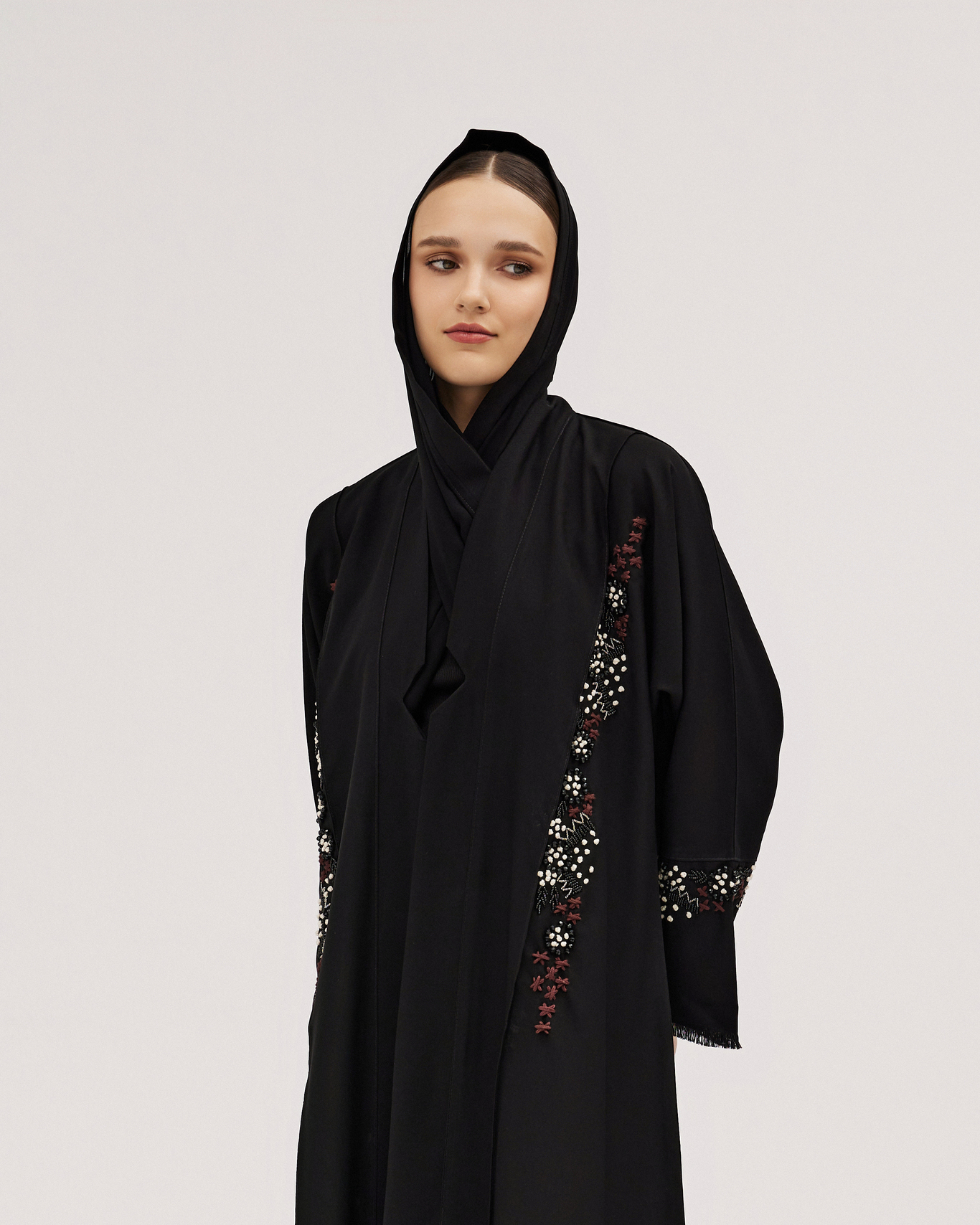 عبايات سوروزيه – عبايات لينن نص كلوش بتصميم لف وتطريز زخرفي بخيوط سوداء – تيفاني