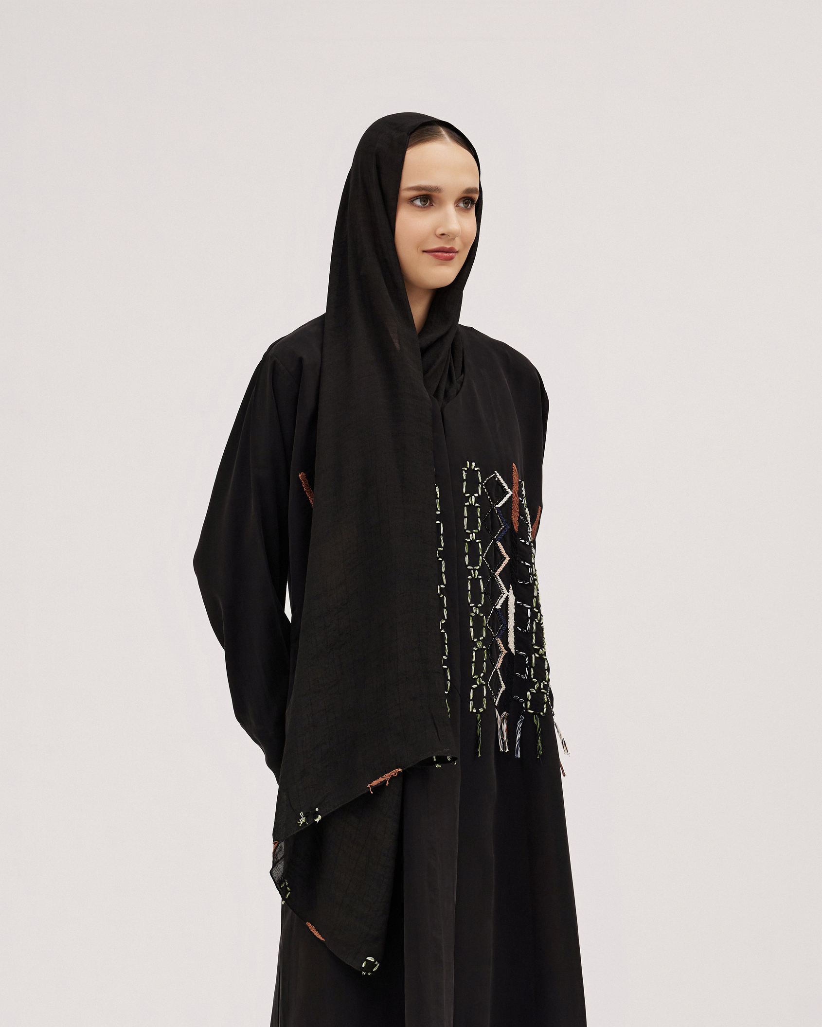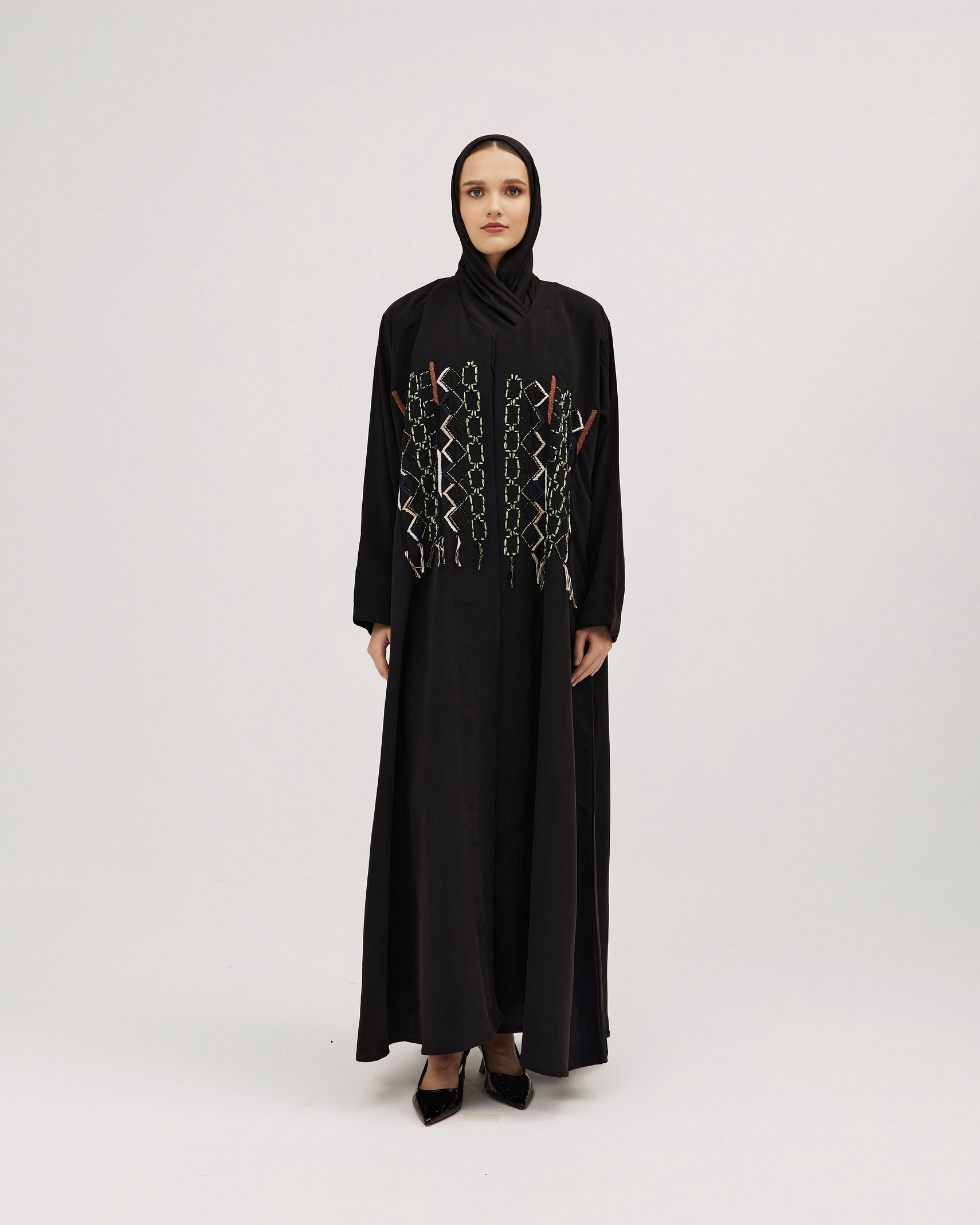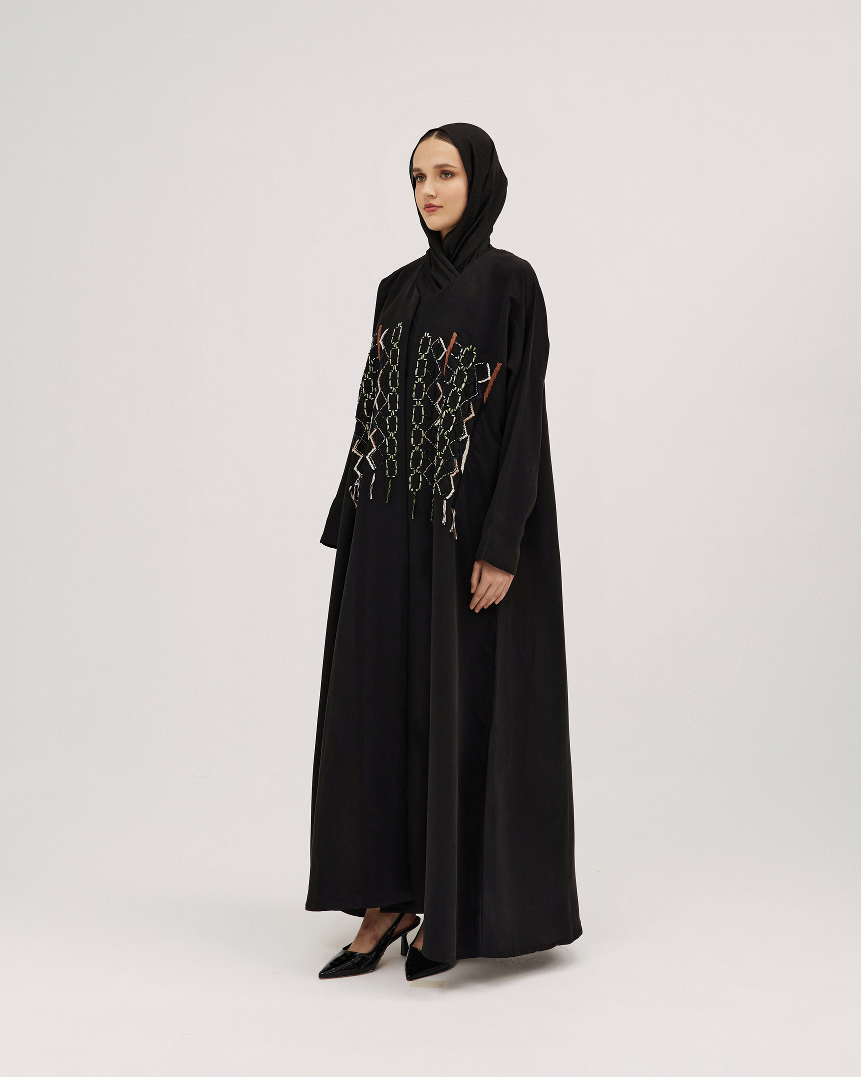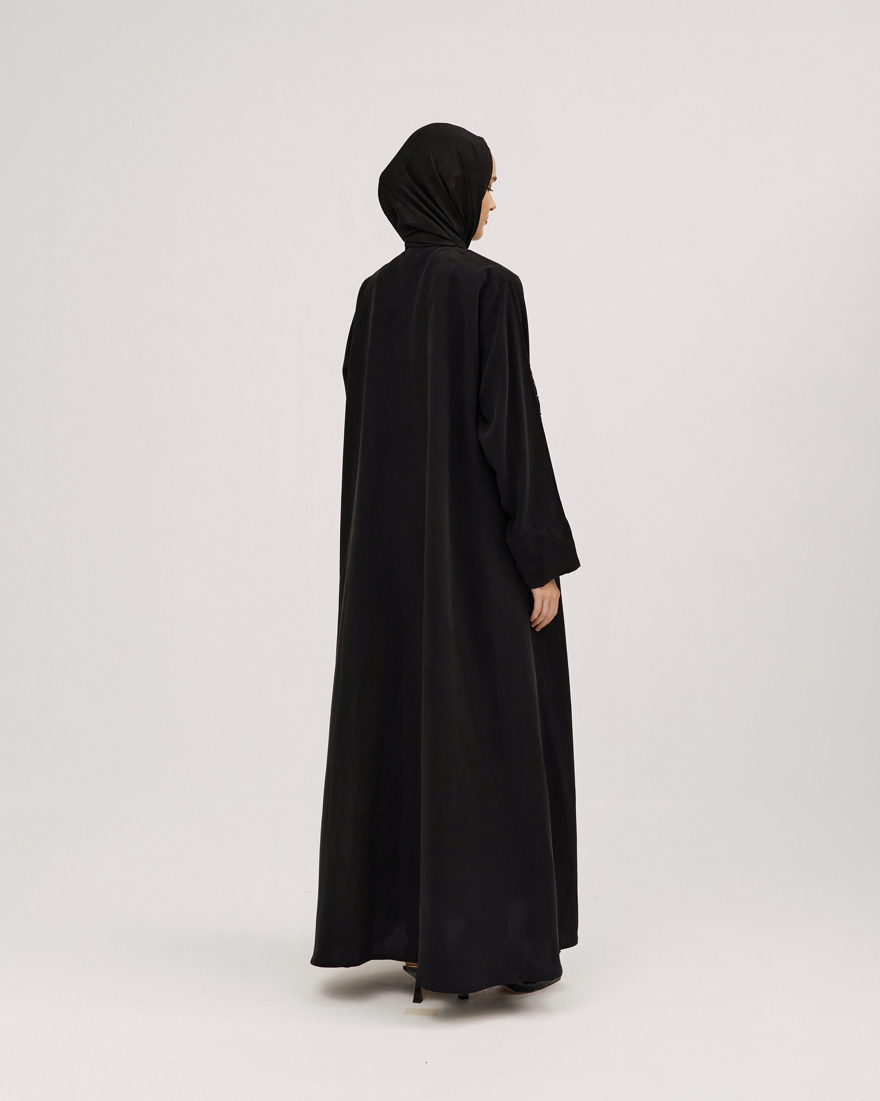 عبايات سوروزيه – عبايات لف سوداء كتان نص كلوش بتطريز هاري مشجر