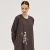 عبايات سوروزيه – عباية باربي كلوش بتصميم لف وكم مقلوب – زيتي ببطانة مشجرة مغطاة بشيفون