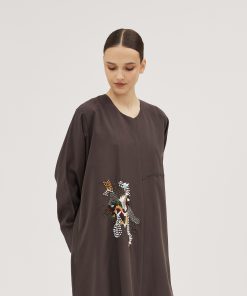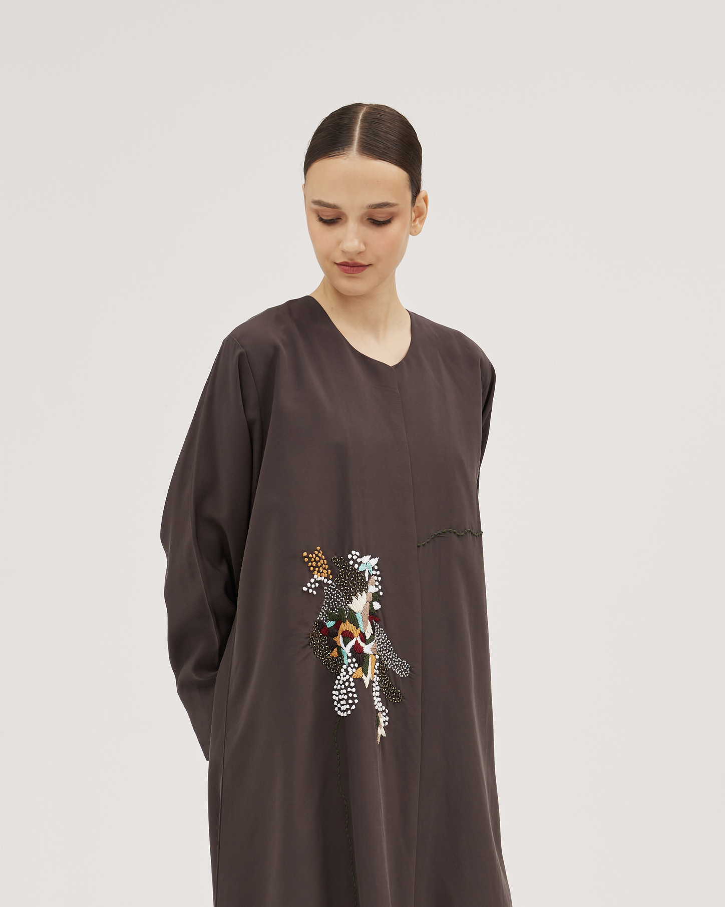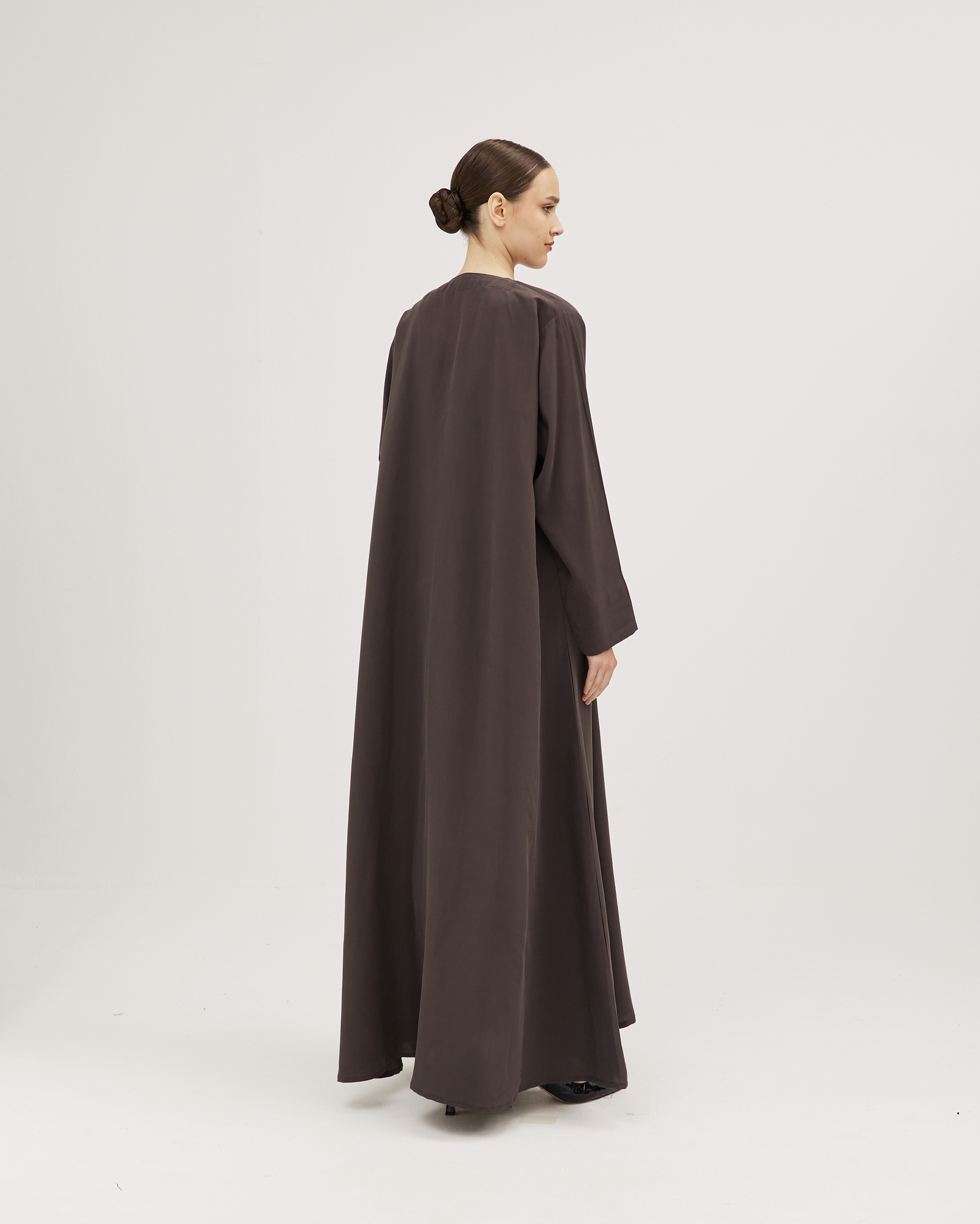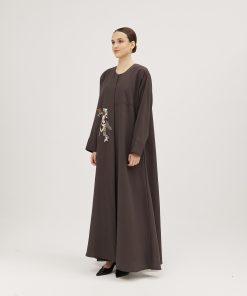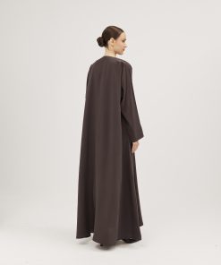 عبايات سوروزيه – عبايات لينن نص كلوش بتصميم لف وتطريز زخرفي بخيوط سوداء – تيفاني