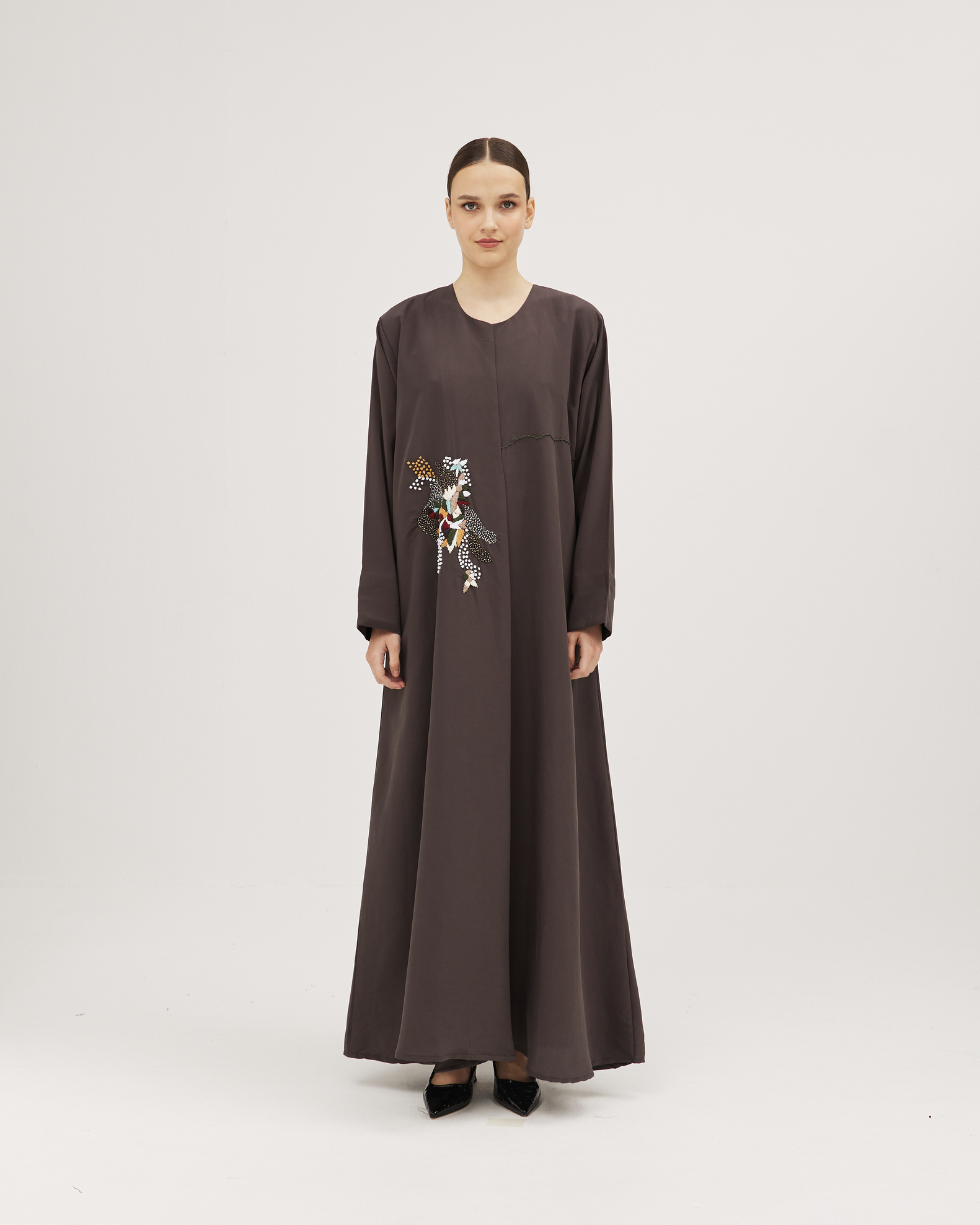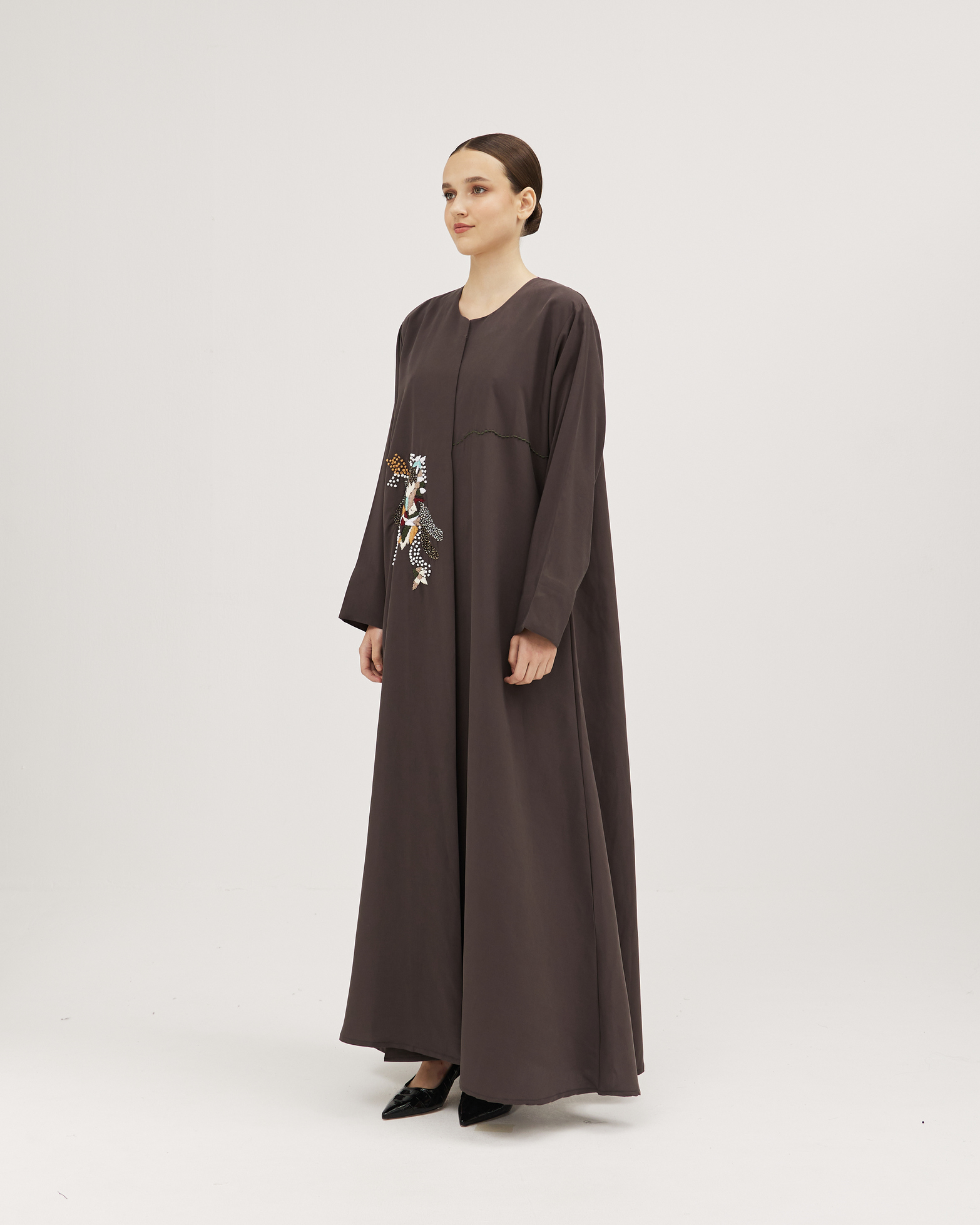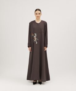 عبايات سوروزيه – عبايات باربي تفته نص كلوش بتشجيرة أسفل العباية باللون الذهبي والموف