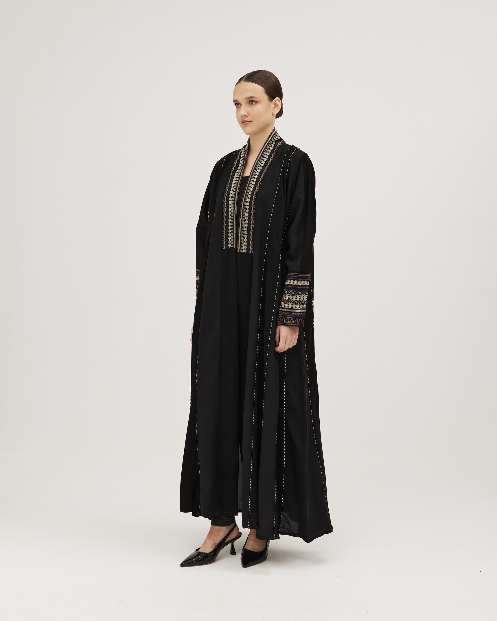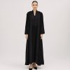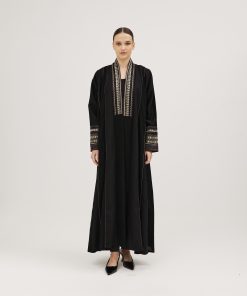 عبايات سوروزيه – عباية كتان كلوش بطقطق وأكمام مقلوبة مشجرة بالريش – أسود