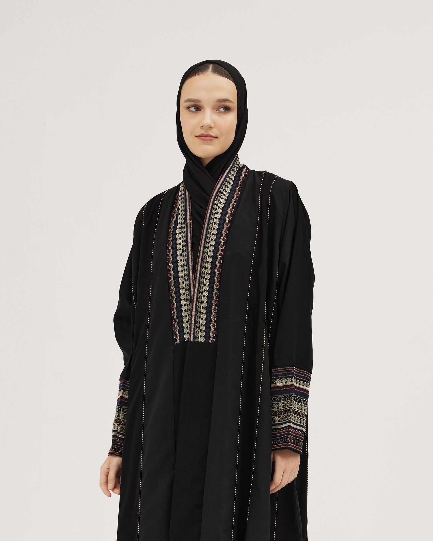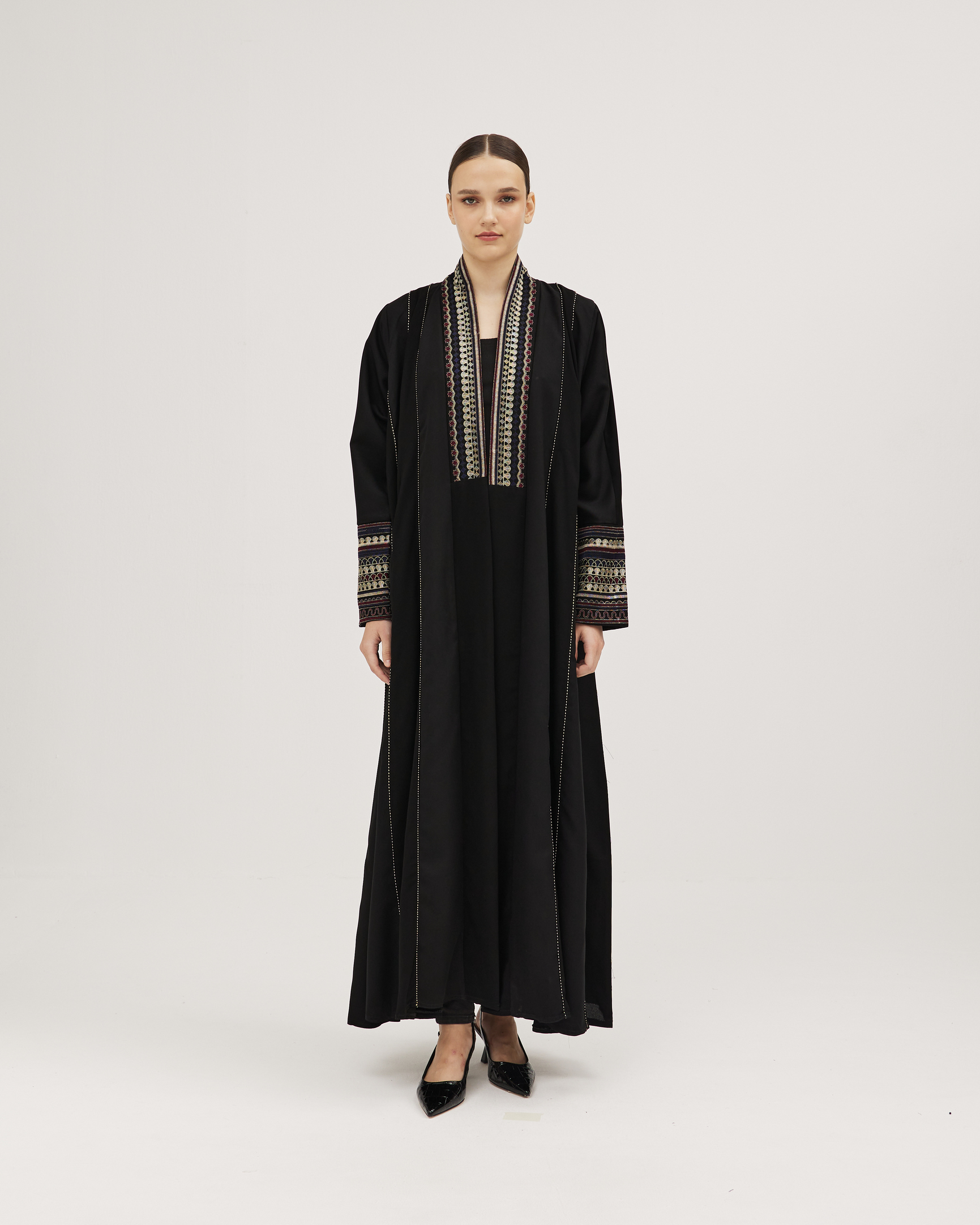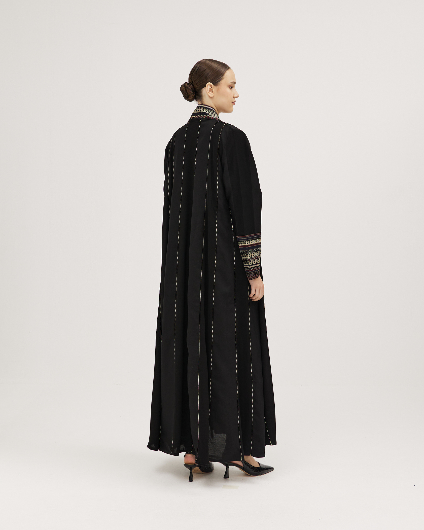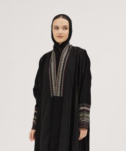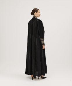 عبايات سوروزيه – عباية انترنت دبل كلوش سوداء مزينة بخطوط طولية مع فصوص سوداء على الأكمام