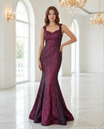 فستان سهرة طويل فخم – عنابي بتصميم مميز لطلة ملكية