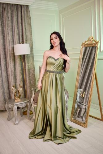 فستان سهرة ستان زيتي بكتف واحد طويل – أناقة ملكية بلمعة حريرية للمناسبات الفخمة