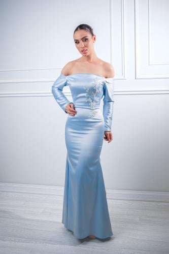فستان سهرة طويل بيبي بلو بقصة أنيقة ولمسة فاخرة