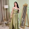 فستان سهرة ستان زيتي بكتف واحد طويل – أناقة ملكية بلمعة حريرية للمناسبات الفخمة