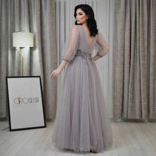 فستان سهرة طويل فخم – عنابي بتصميم مميز لطلة ملكية