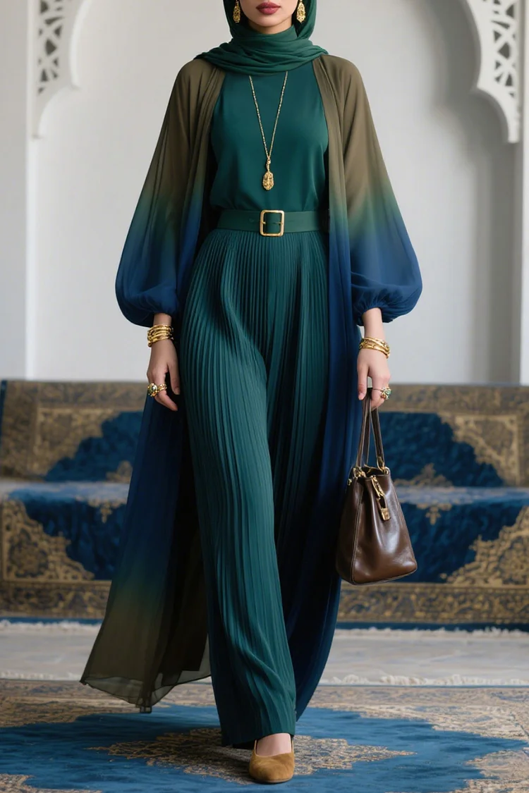 فيفيتش – طقم عباية أومبري مكون من 3 قطع: بلوزة بأكمام طويلة ورقبة دائرية وبنطال مطوي