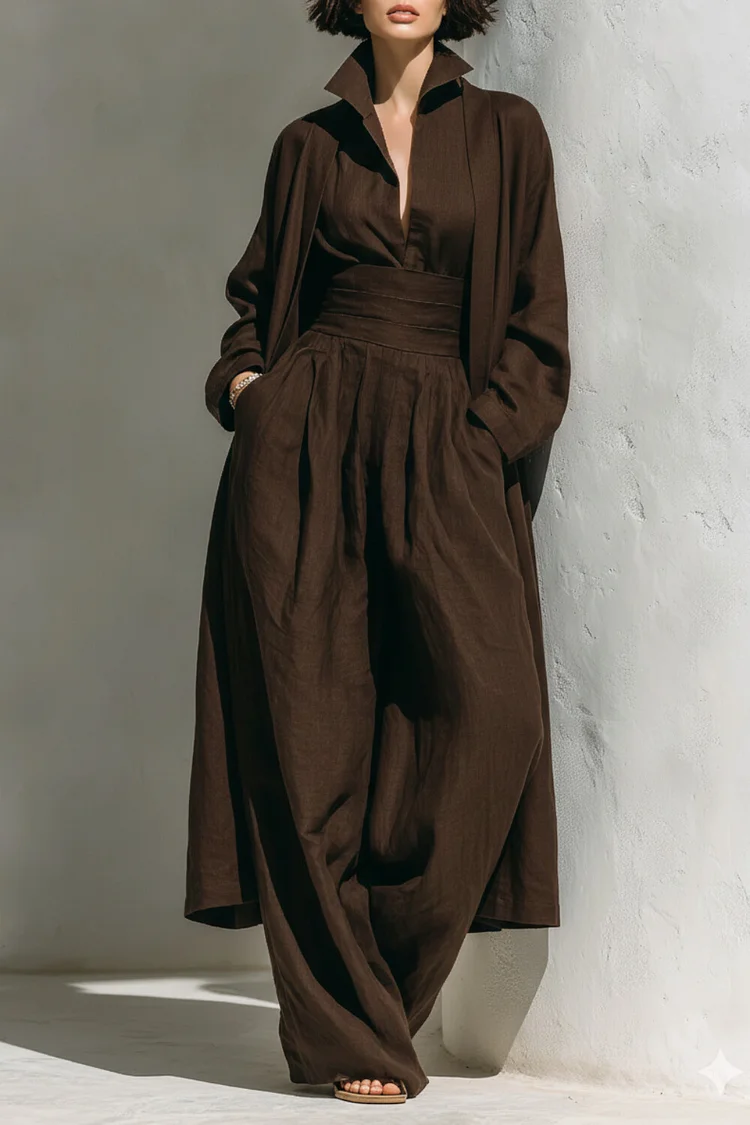 فيفيتش – طقم عباية بلون موحد، بدون أكمام، واسعة الساقين، من الكتان، قطعتين [طلب مسبق]