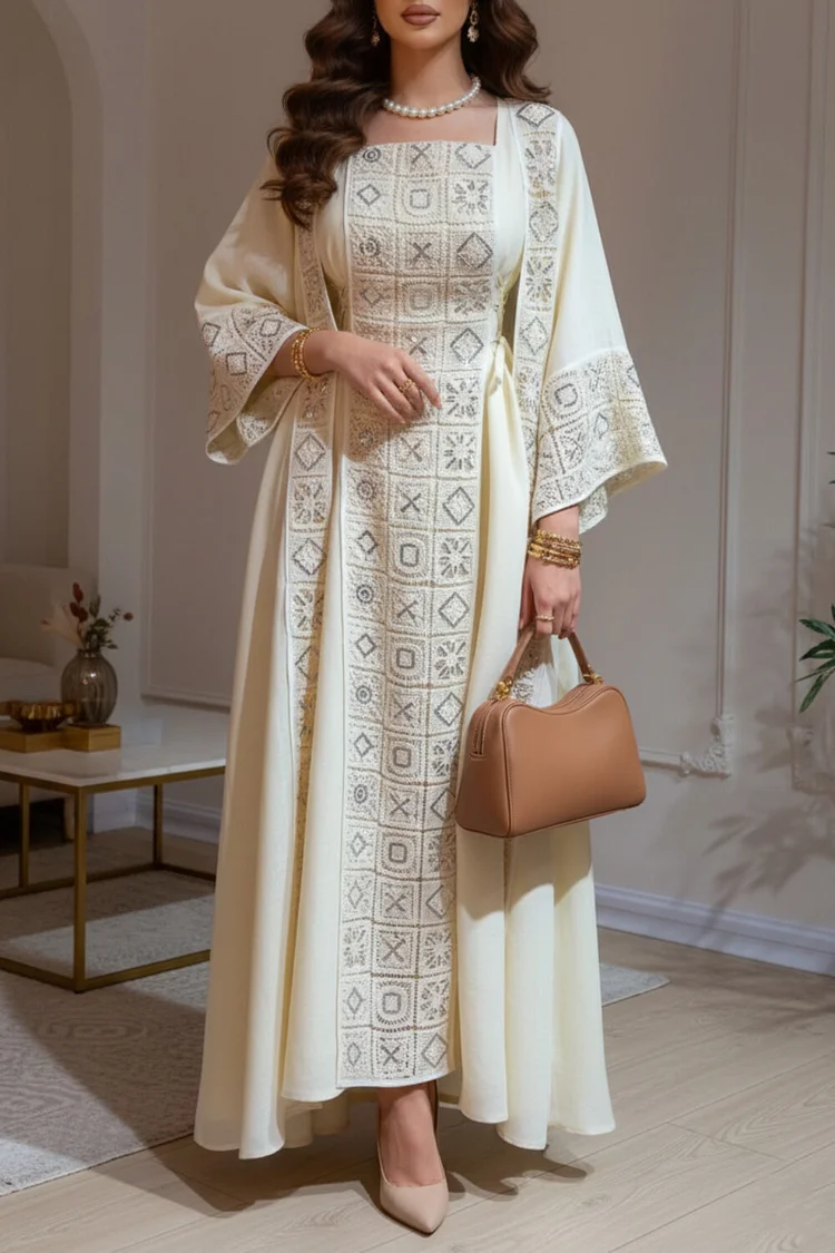 فيفيتش – طقم عباية مطرزة بنقوش هندسية، فستان ماكسي برباط، قطعتين – أبيض [طلب مسبق]