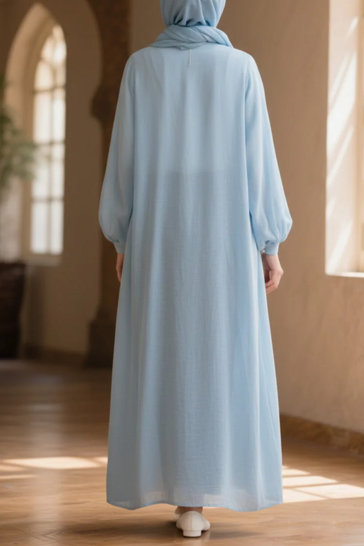 فيفيتش – عباية طويلة من الكتان بأكمام فانوس مطرزة بالزهور – أزرق [طلب مسبق]