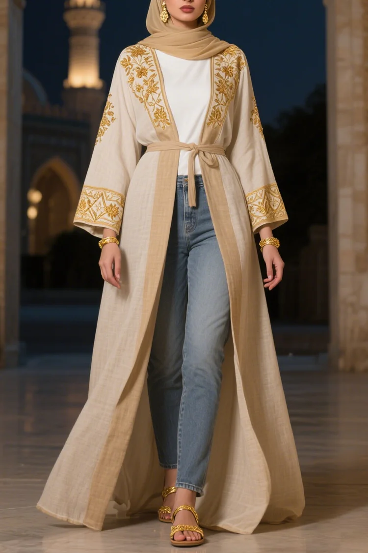 فيفيتش – عباية من الكتان بأكمام طويلة وتطريز نباتي، كارديجان طويل [طلب مسبق]