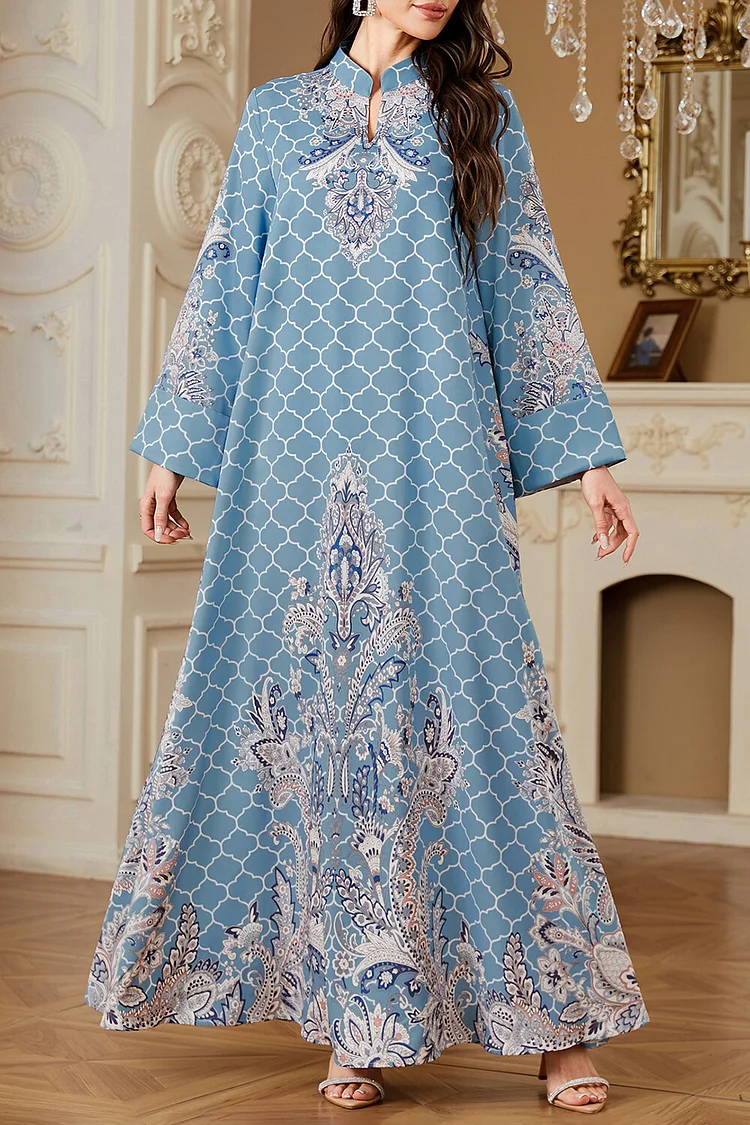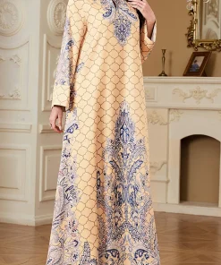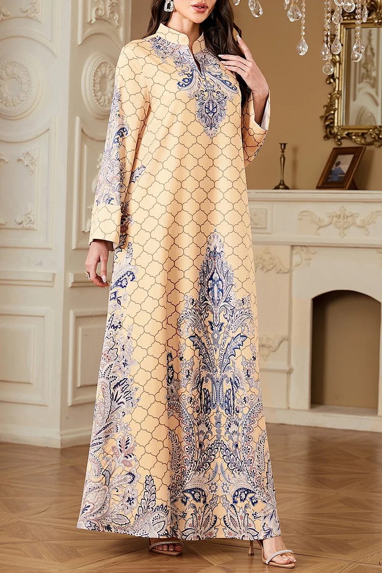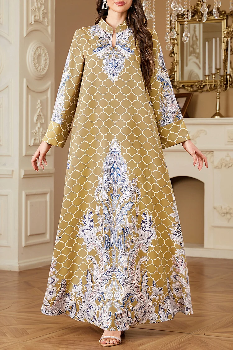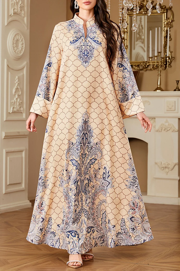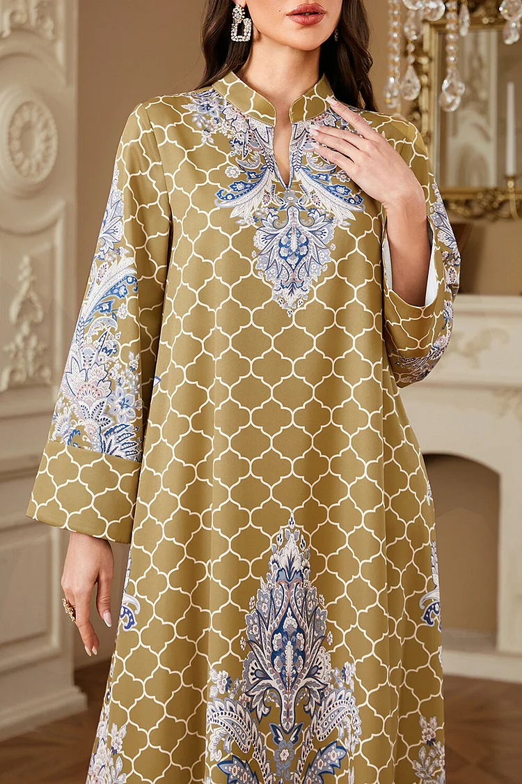 فيفيتش – فساتين ماكسي كفتان بأكمام طويلة وياقة واقفة مطبوعة بنقوش عرقية