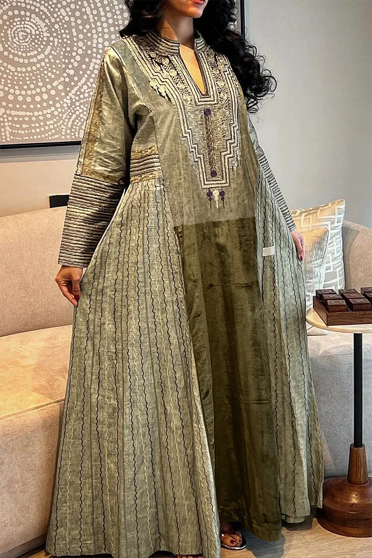 فيفيتش – فساتين ماكسي من الكتان المطبوع بنقوش قبلية وياقة عالية من المخمل الكفتان