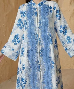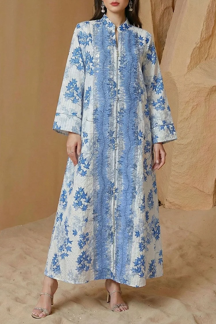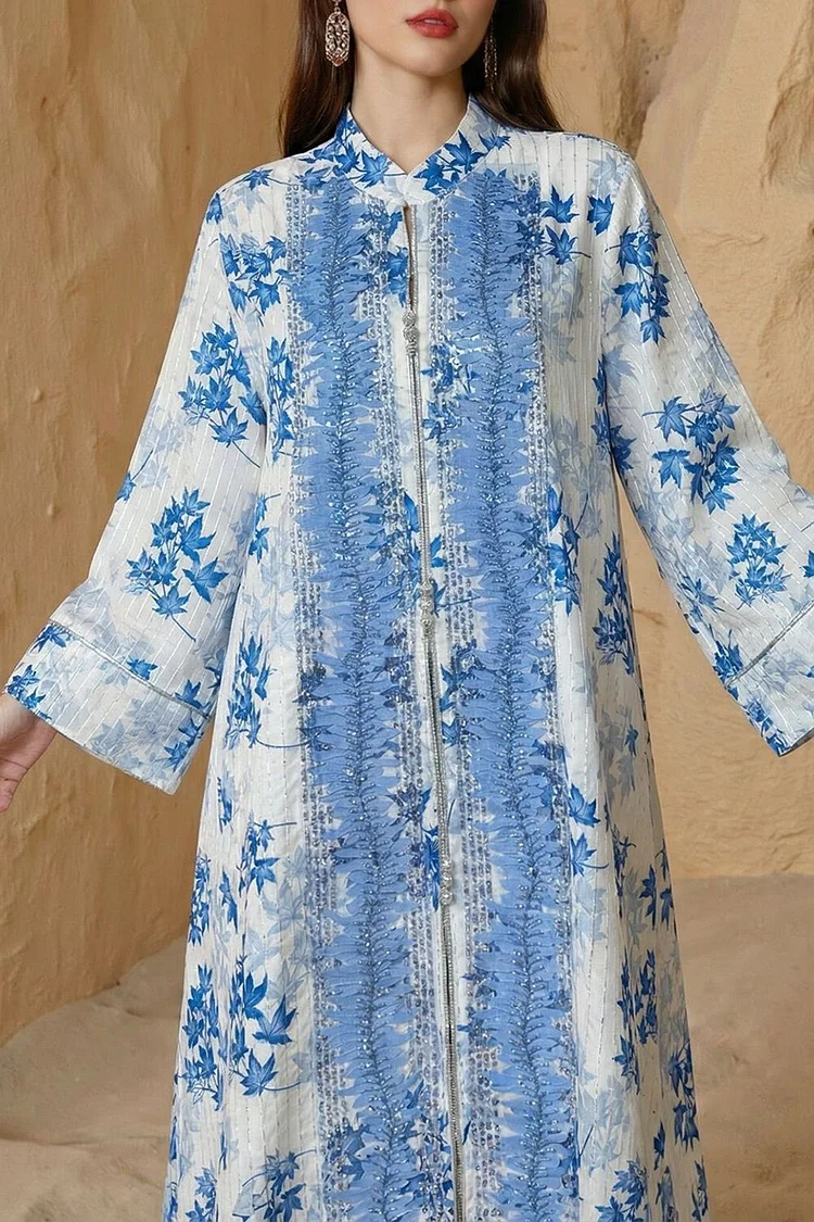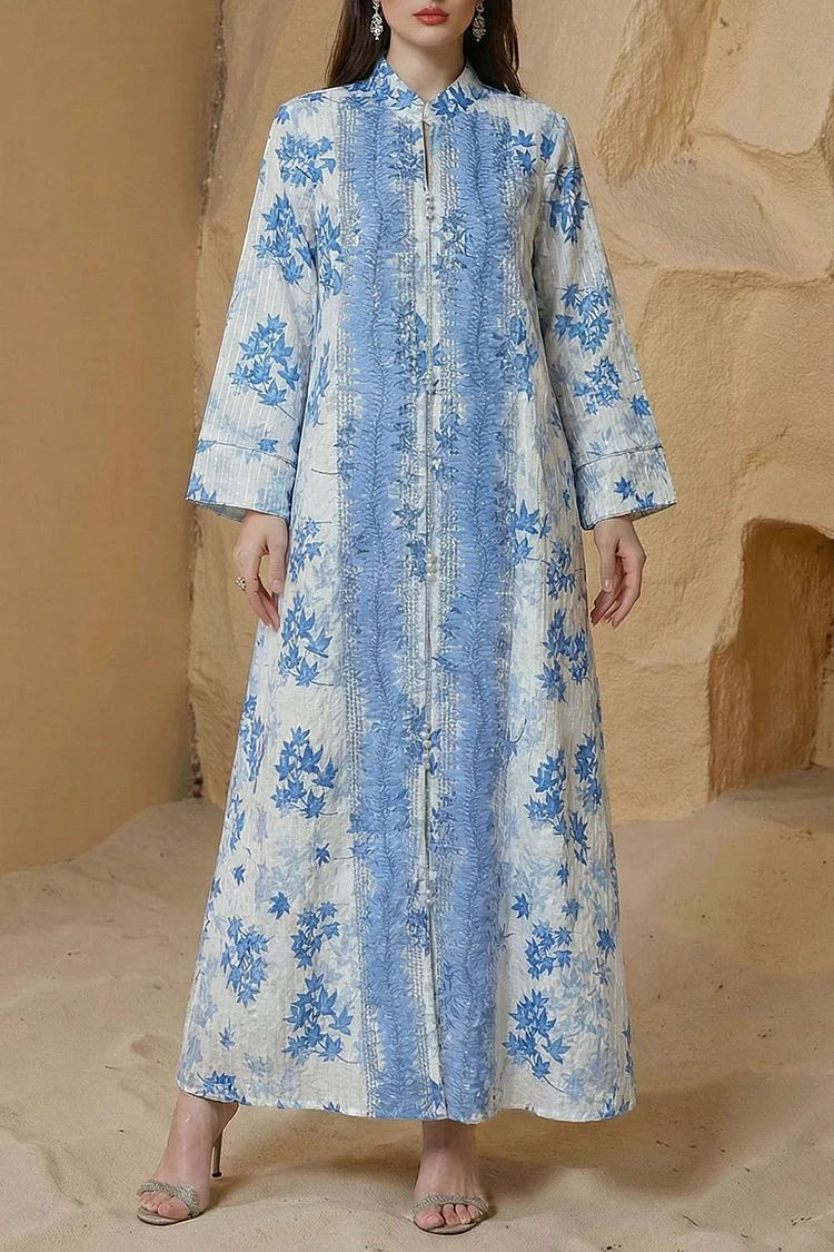 فيفيتش – فستان ماكسي أزرق طويل بأكمام طويلة وياقة واقفة مطرز بالكامل بنقشة مطبوعة – ياقة واقفة