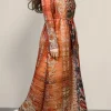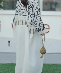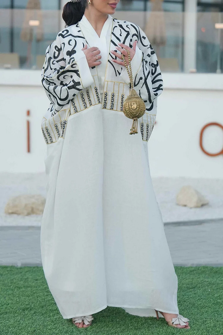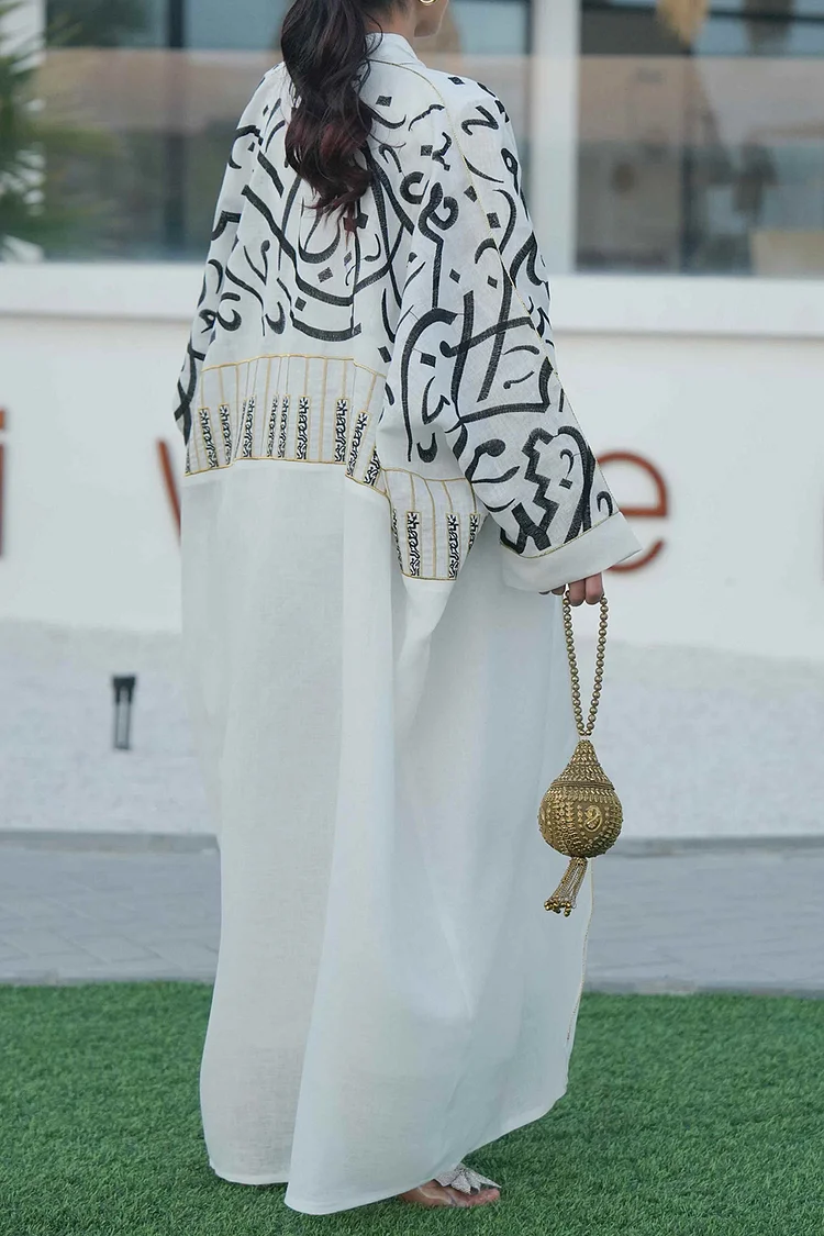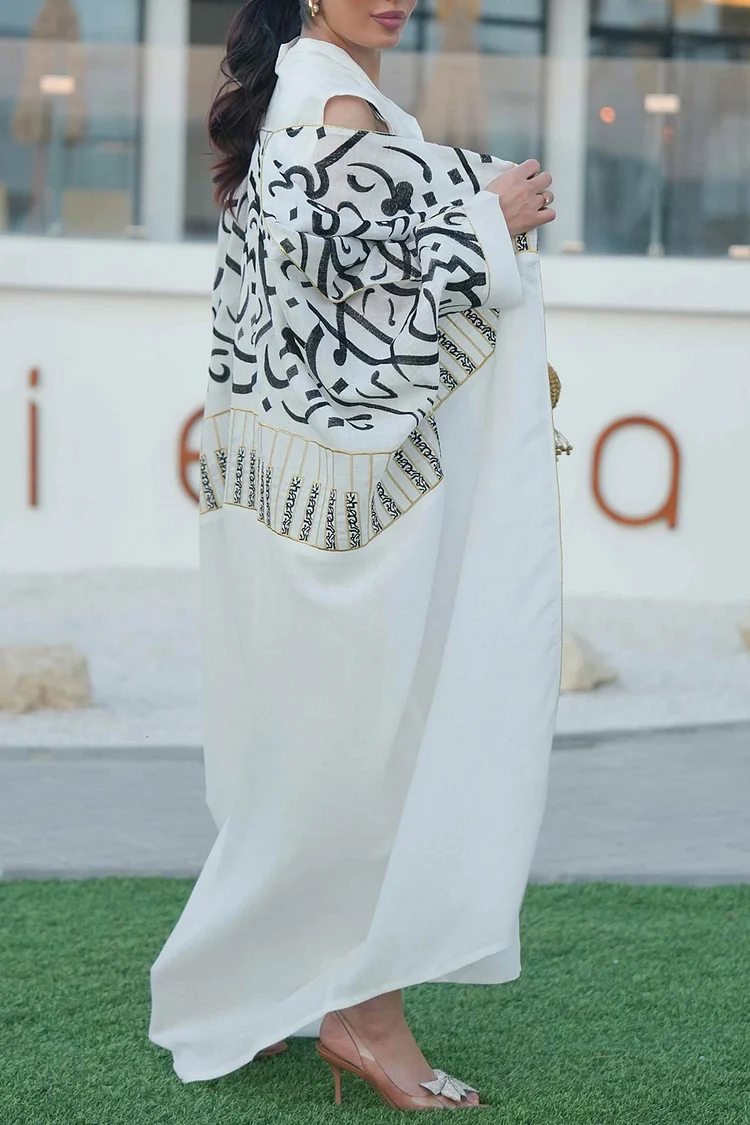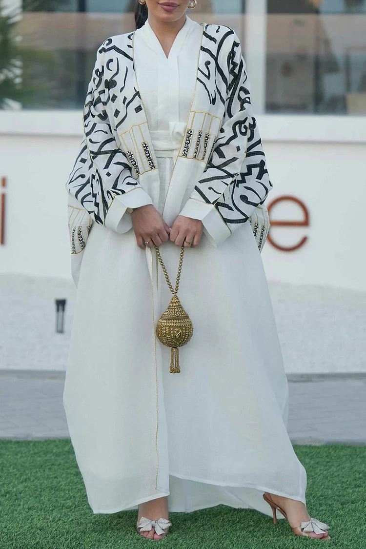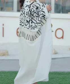 فيفيتش – فستان ماكسي برباط، عباية من الكتان بطبعة عربية، طقم من قطعتين – أبيض