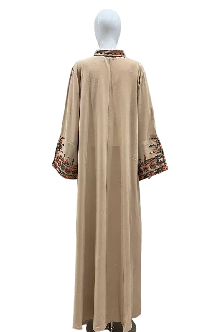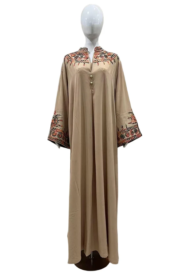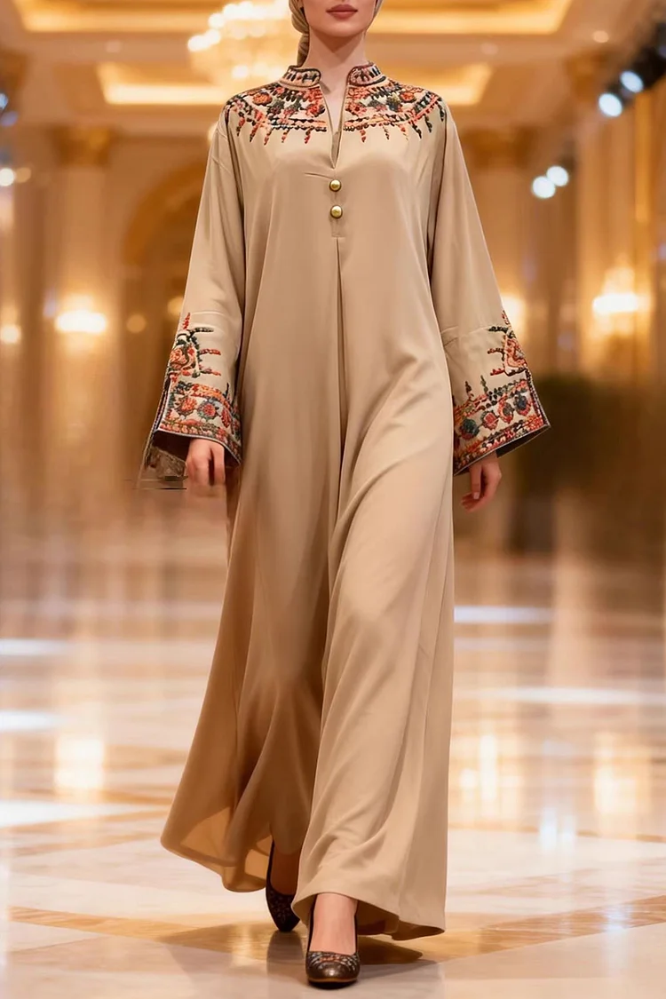 فيفيتش – فستان ماكسي كاجوال بأكمام طويلة مطرز بأزرار وياقة مفتوحة، بتصميم قفطان أنيق.