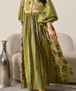 فيفيتش – فستان ماكسي مخطط بنقشة زهور، برباط أمامي، بأكمام نصف منفوخة [طلب مسبق]