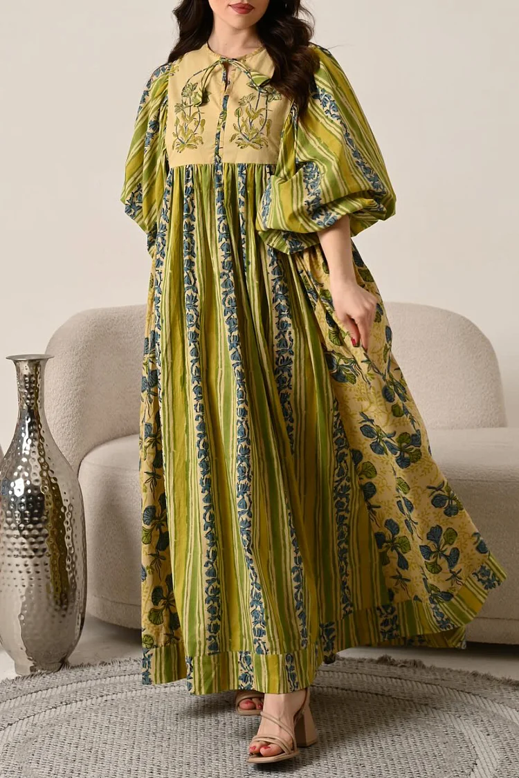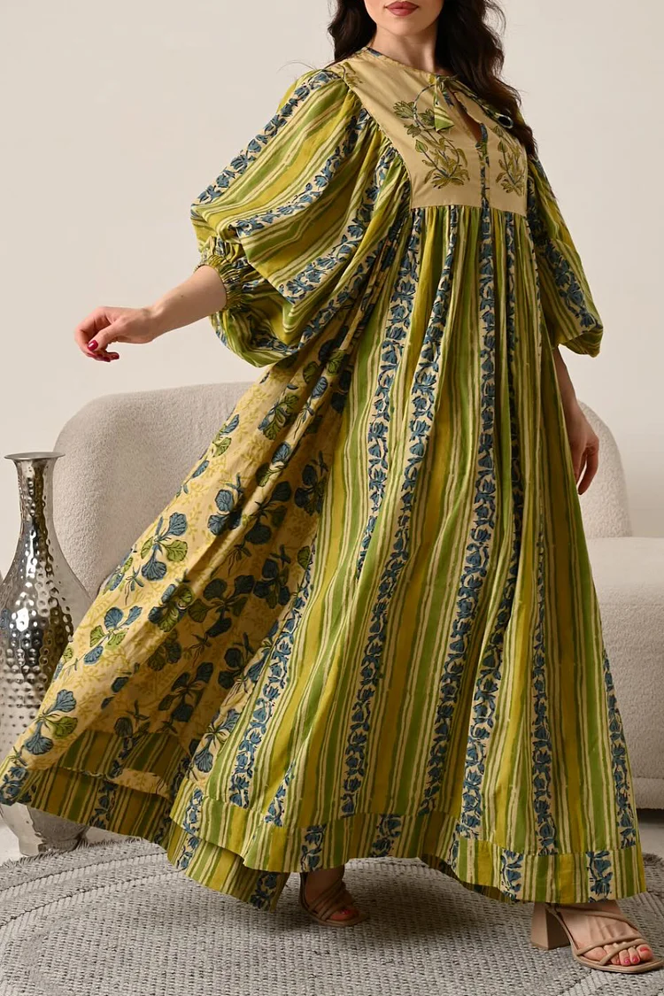 فيفيتش – فستان ماكسي مخطط بنقشة زهور، برباط أمامي، بأكمام نصف منفوخة [طلب مسبق]