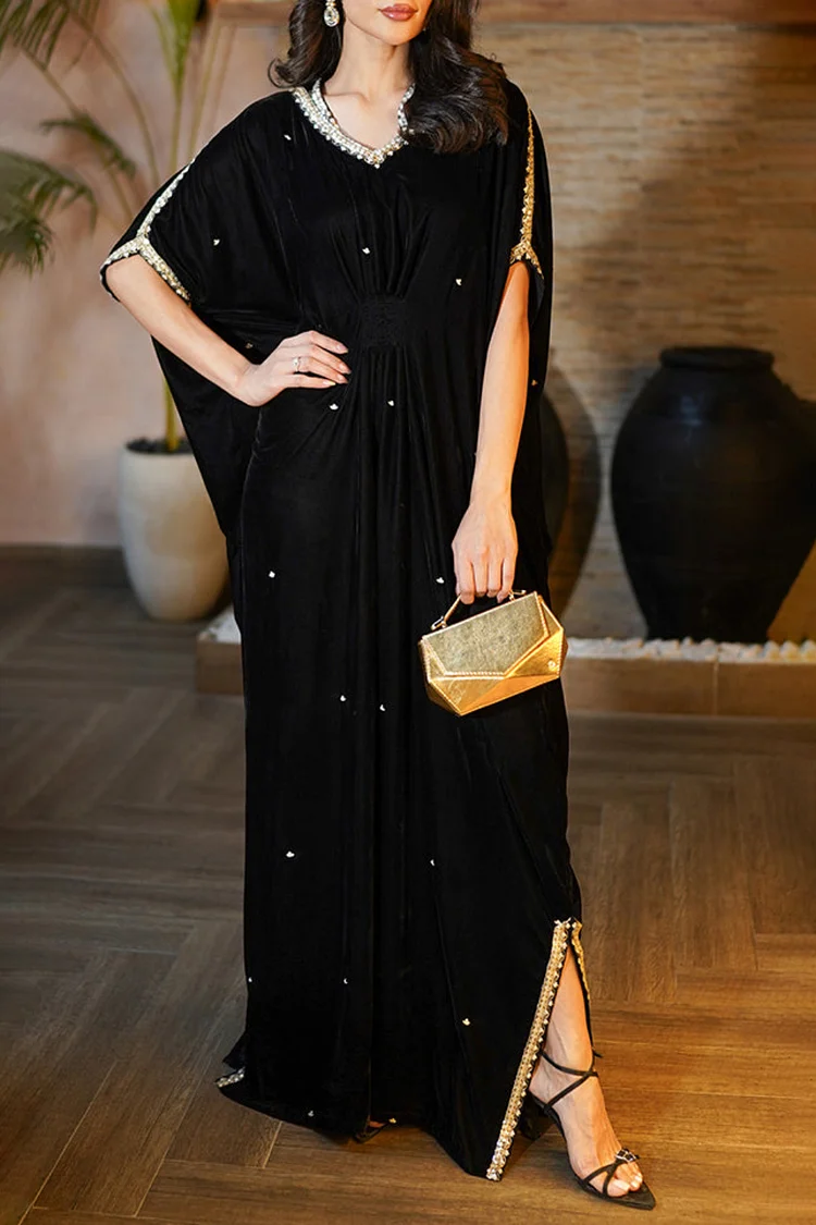 فيفيتش – فستان ماكسي مخملي أسود بفتحة جانبية وأكمام قصيرة مزين بفتحة جانبية [طلب مسبق]