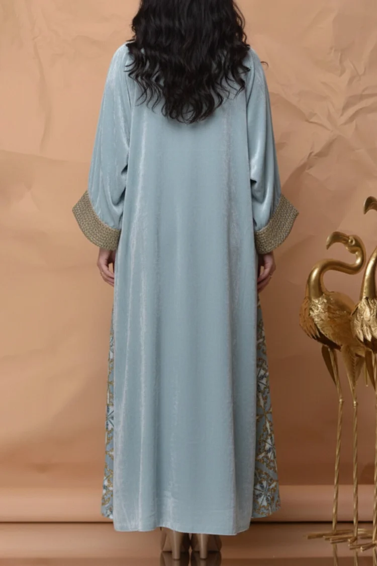 فيفيتش – فستان ماكسي مخملي مطبوع بنقشة هندسية وفتحة رقبة على شكل حرف V – أزرق [طلب مسبق]