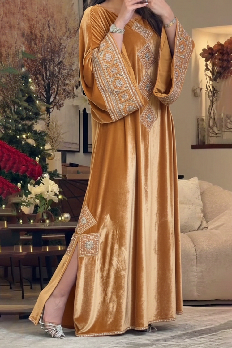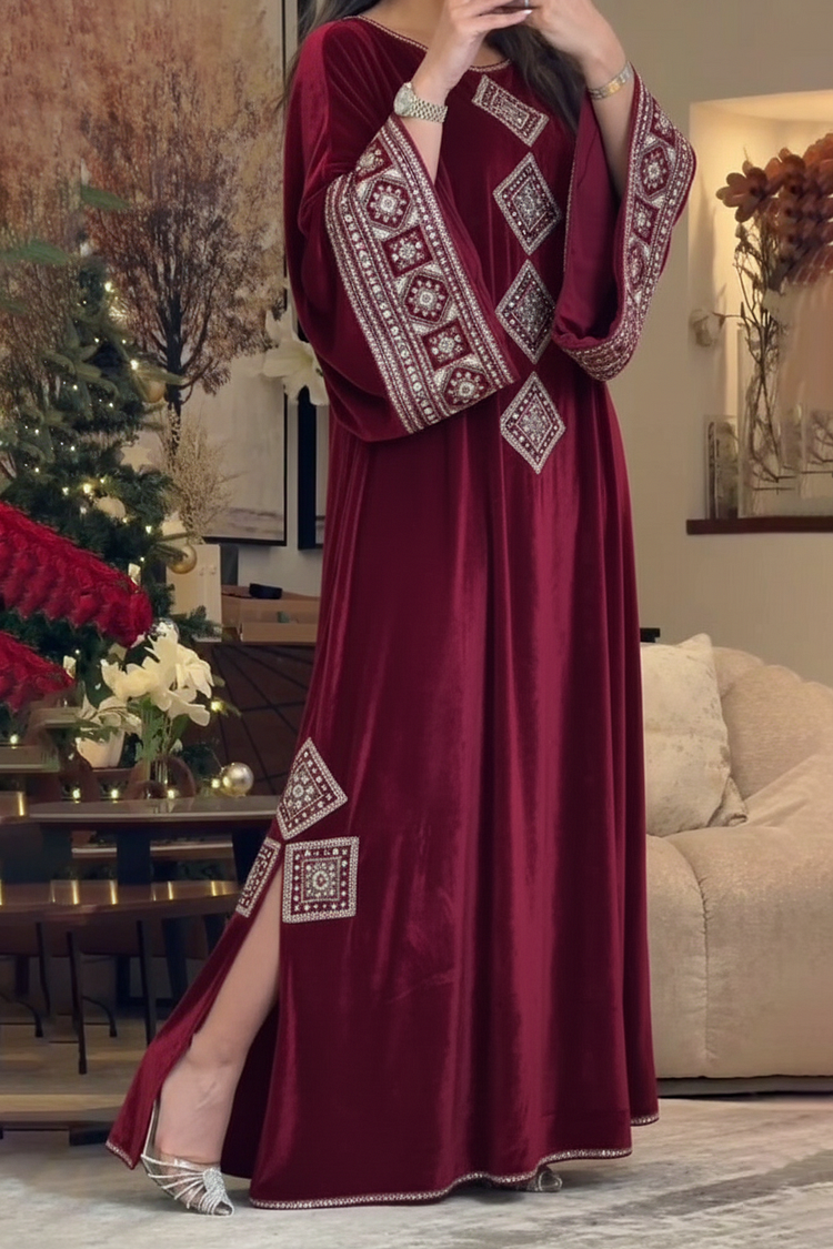 فيفيتش – فستان ماكسي مخملي مطرز بالخرز بتصميم هندسي وحافة مشقوقة [طلب مسبق]