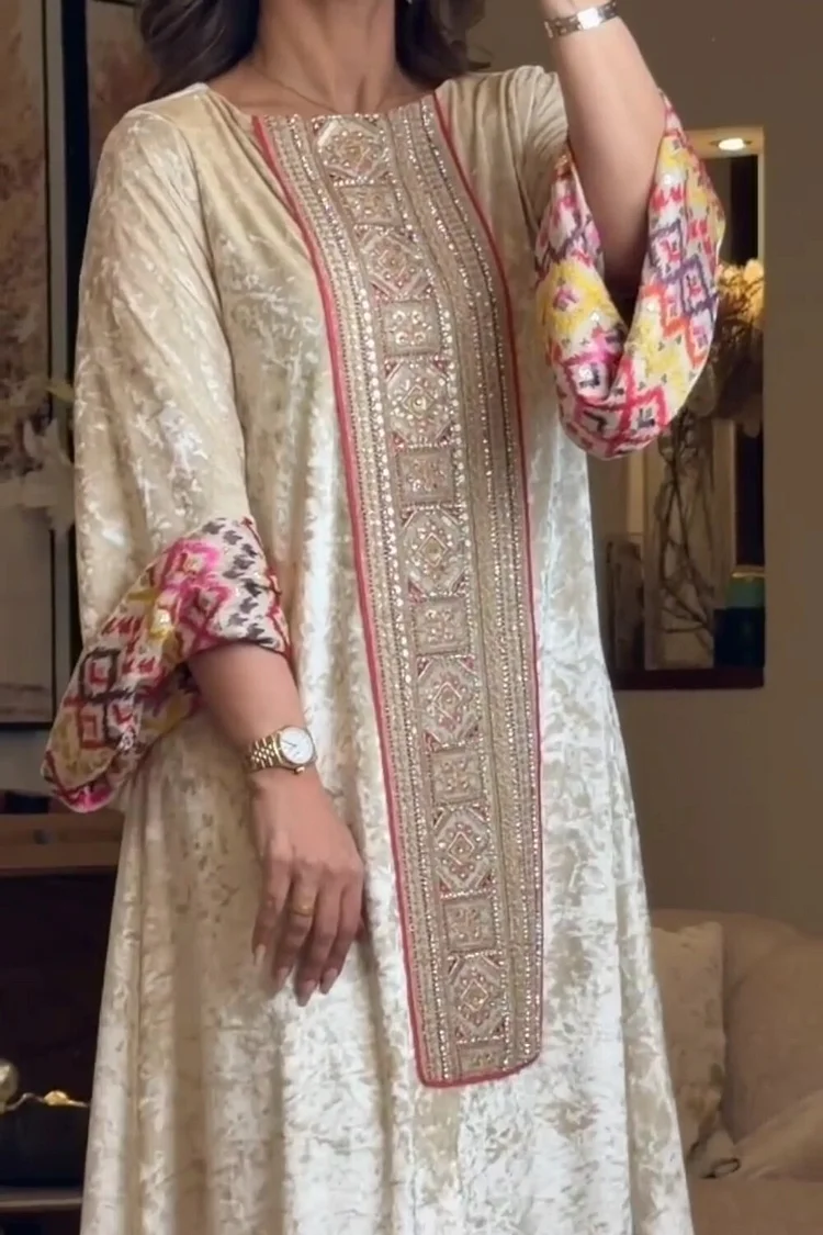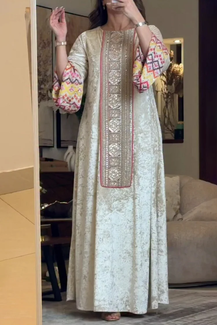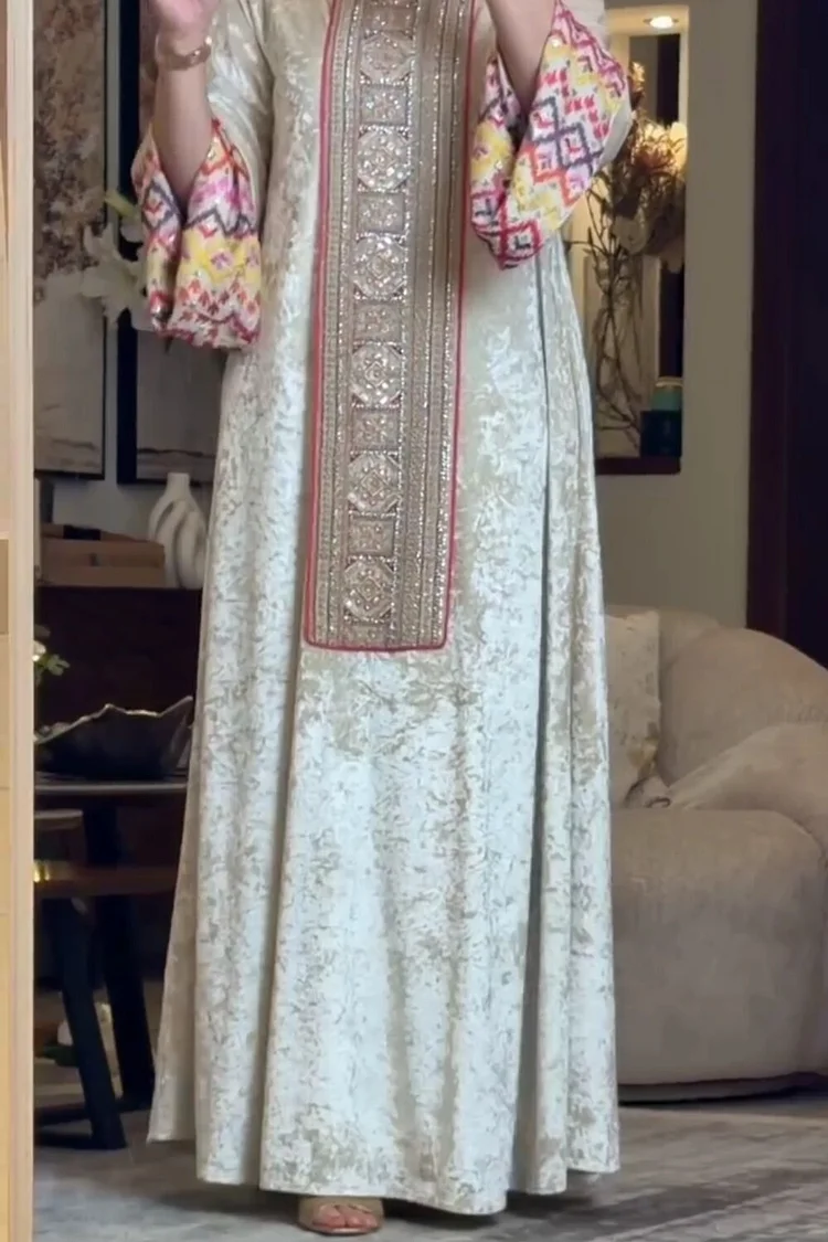 فيفيتش – فستان ماكسي مخملي مطرز بنقشة إيكات – أبيض [طلب مسبق]
