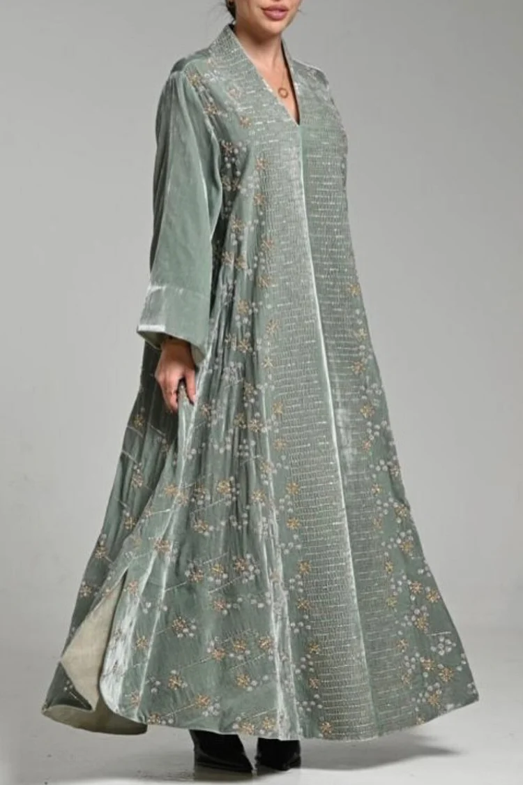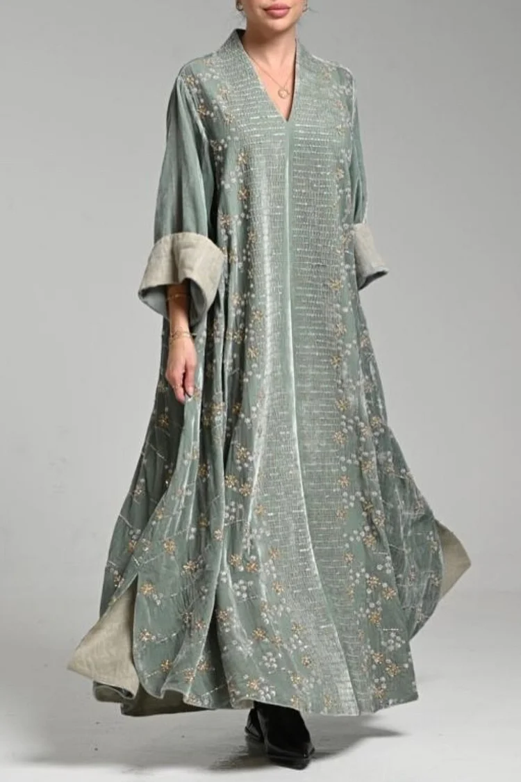 فيفيتش – فستان ماكسي مطرز بالزهور، بأكمام متباينة وفتحة رقبة على شكل حرف V [طلب مسبق]