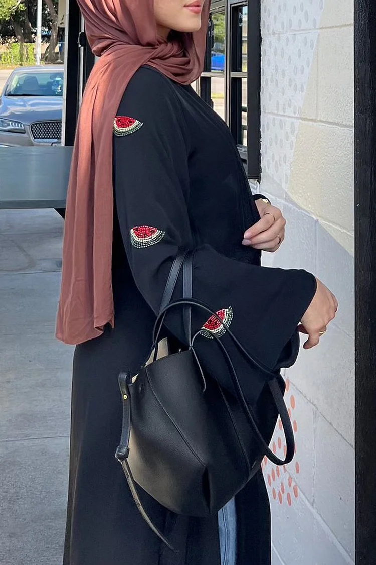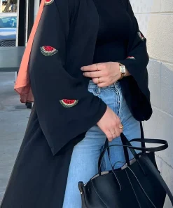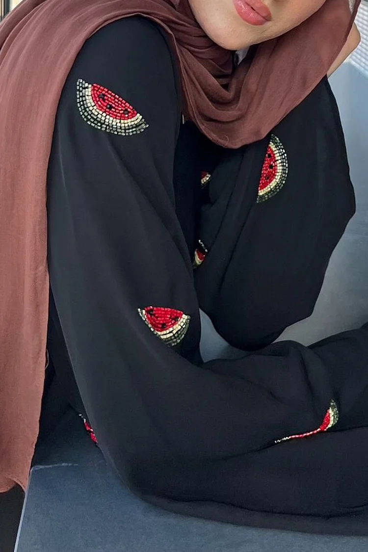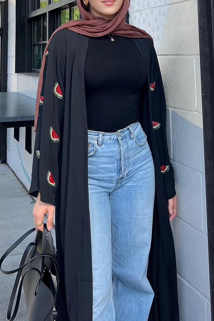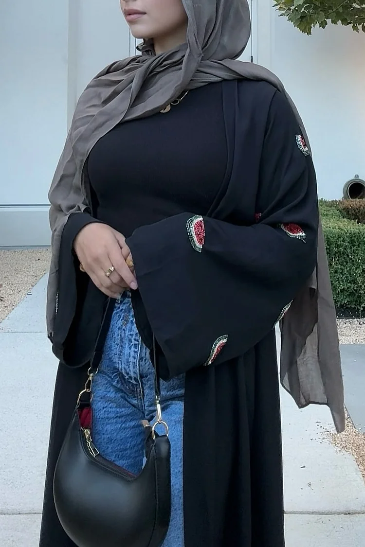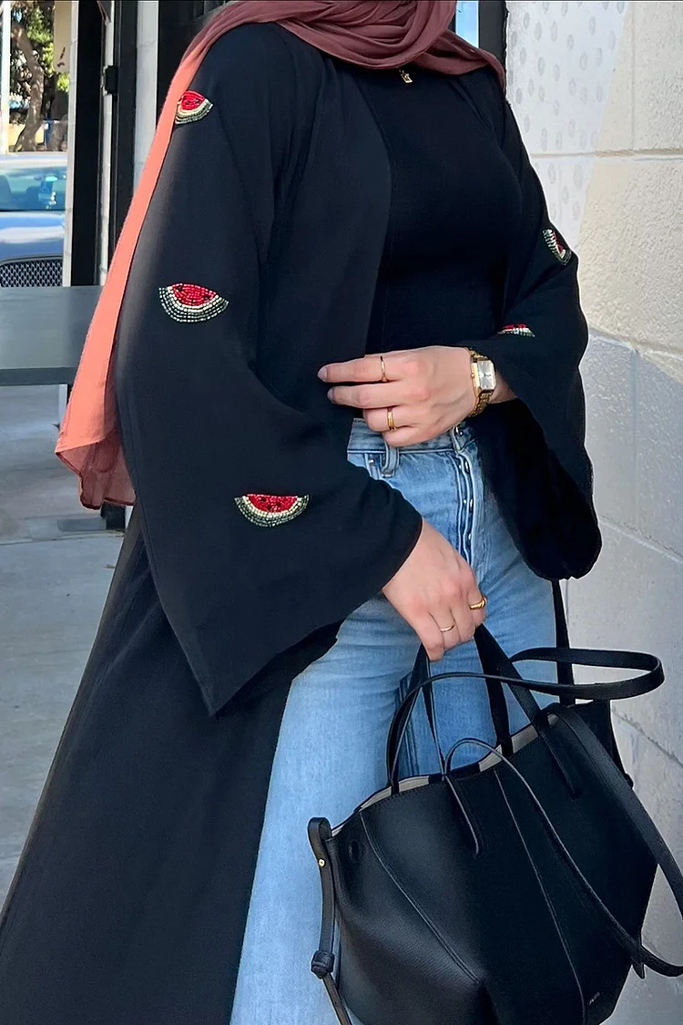 فيفيتش – كارديجان طويل مفتوح من الأمام بتصميم بطيخ مرصع بأحجار الراين للعباية